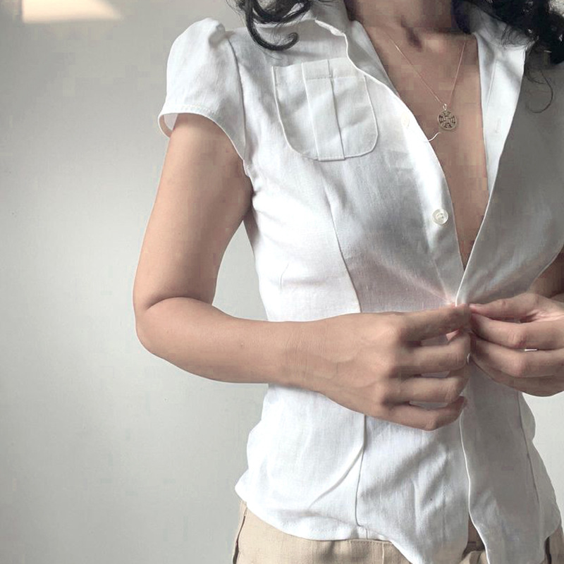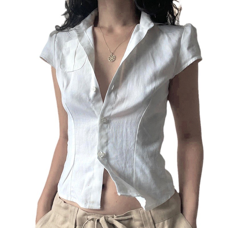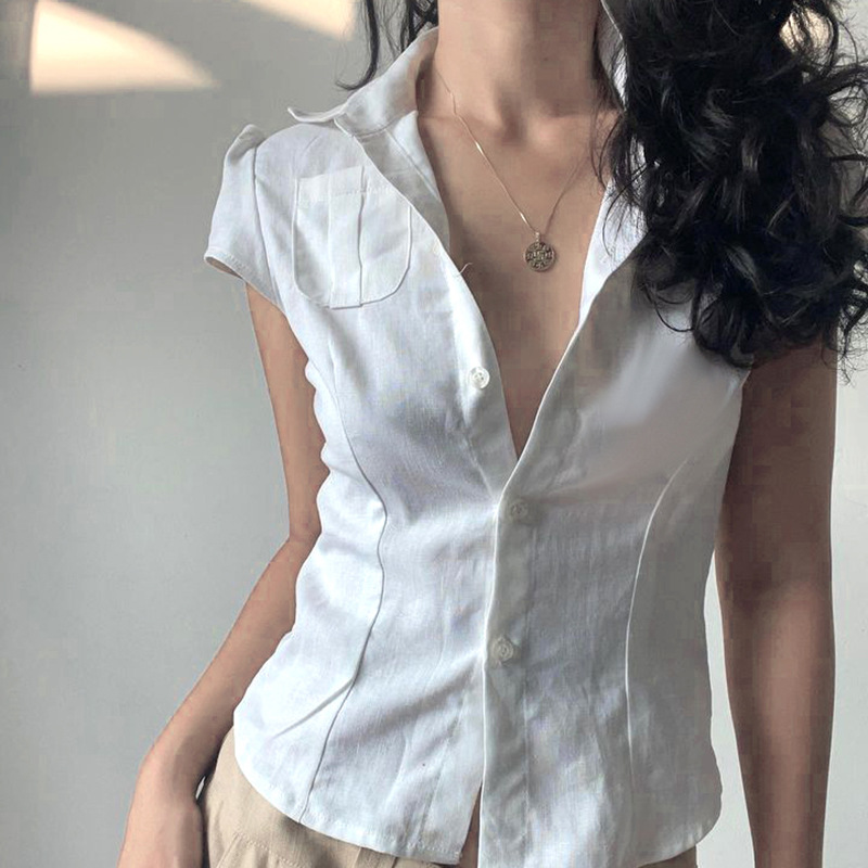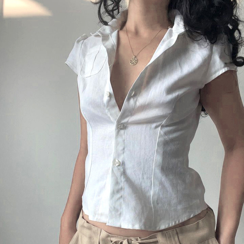 法式小众别致设计感上衣 天丝棉短袖v领薄款白色衬衫女夏新款