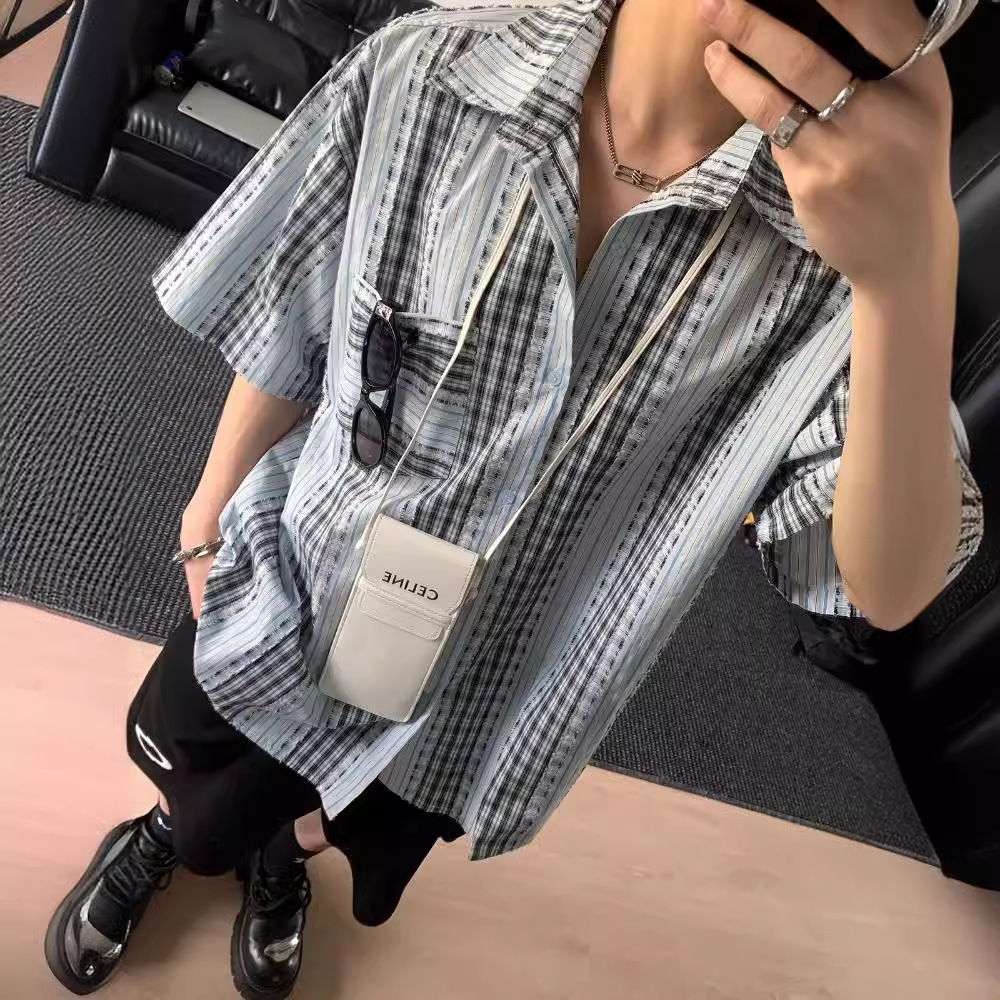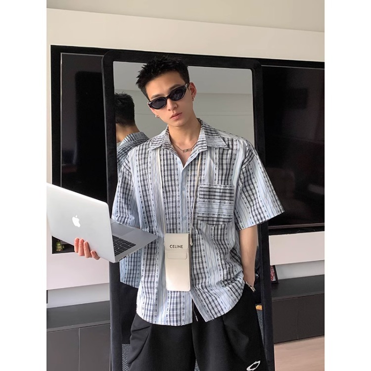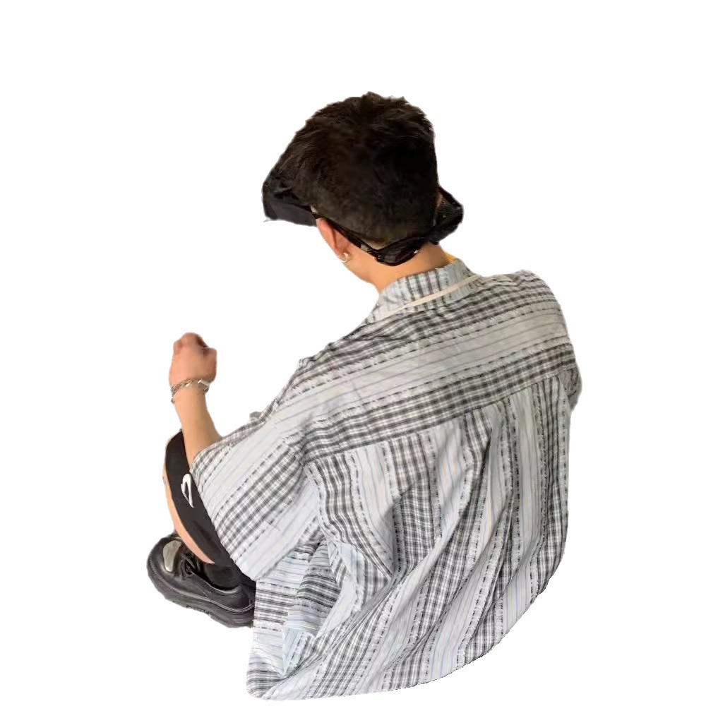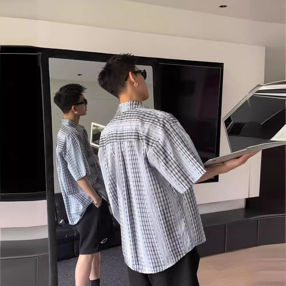 设计感小众格子短袖衬衫男夏季新款潮流百搭宽松痞帅休闲防晒衬衣
