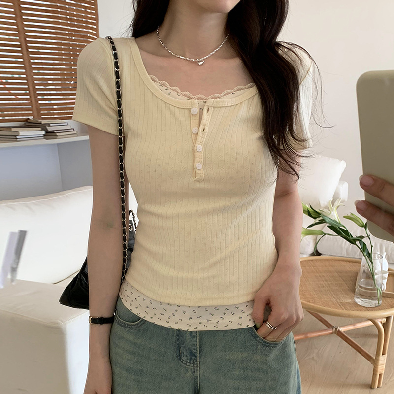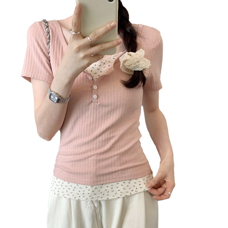 法式甜美气质修身碎花假两件正肩短袖t恤女夏季新款百搭上衣