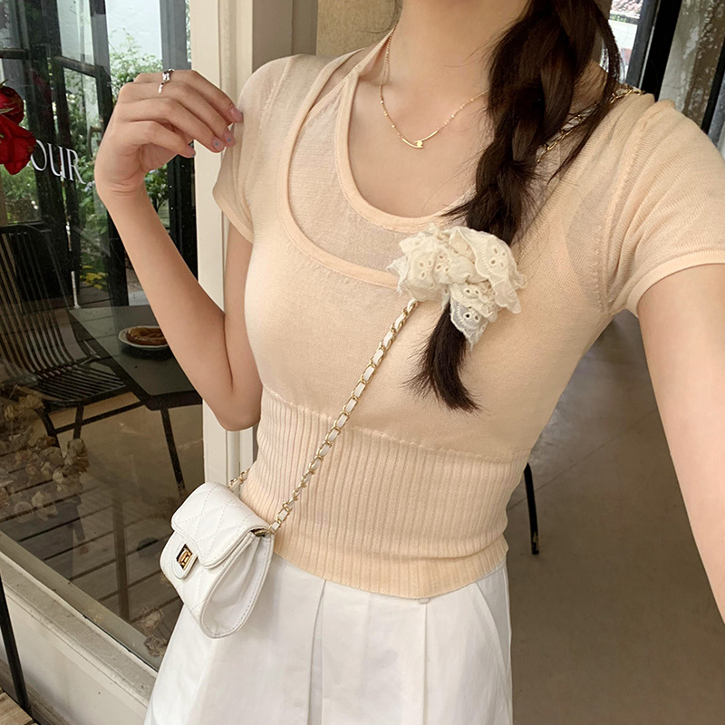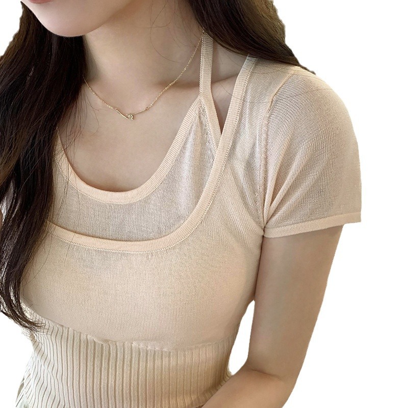设计感辣妹轻薄透气修身夏季新款假两件t恤短袖女针织上衣