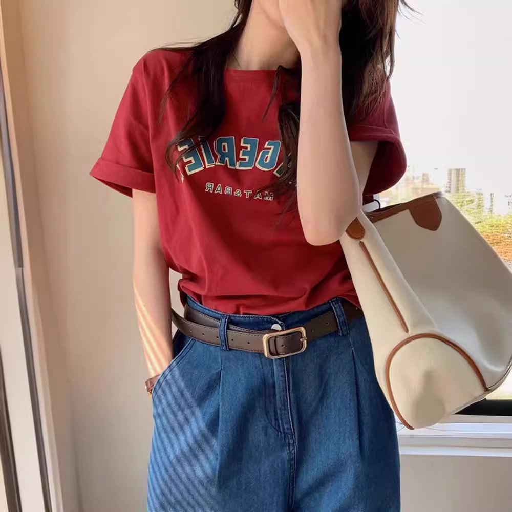 港味复古印花短袖T恤女夏季新款设计感小众圆领百搭正肩上衣