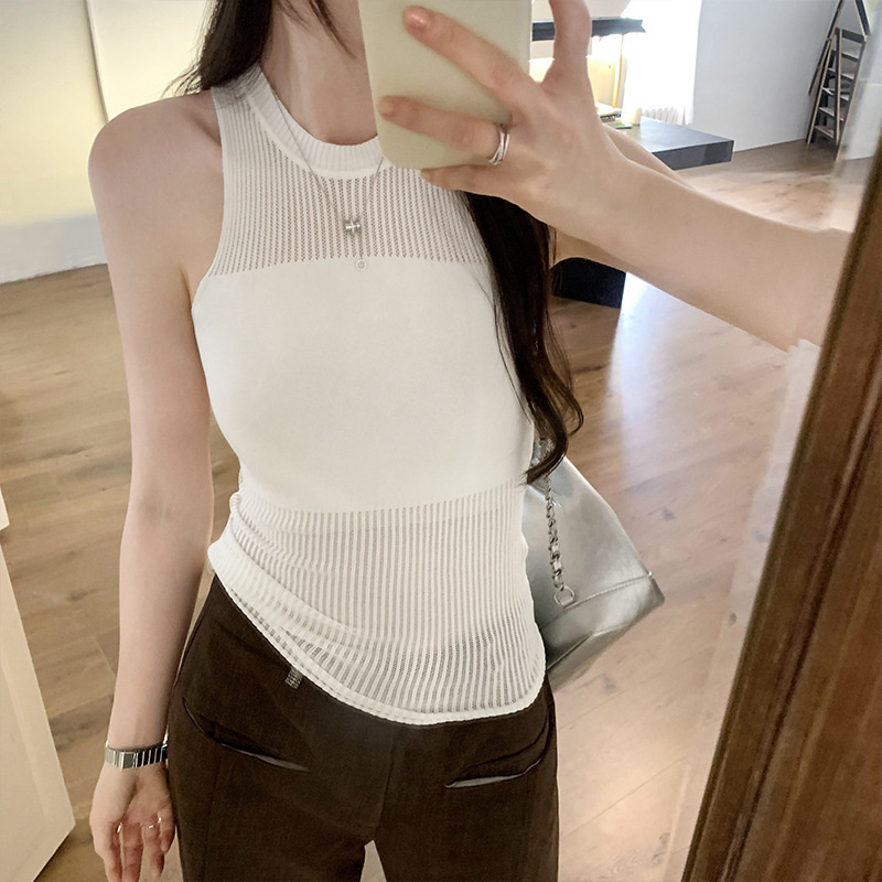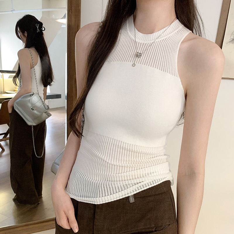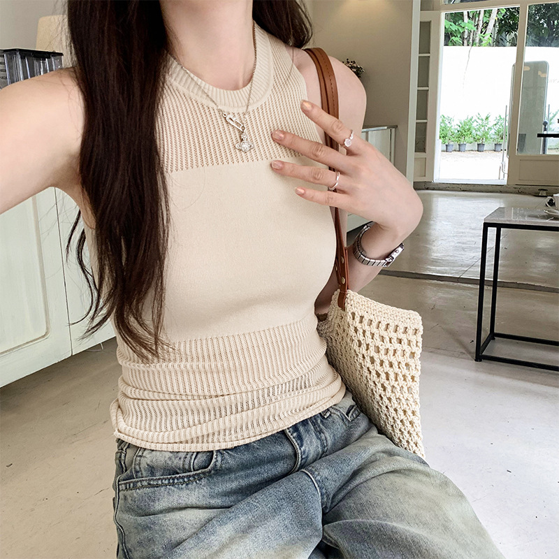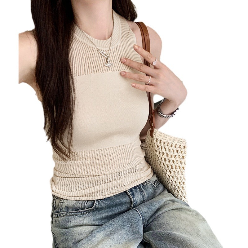 设计感独特镂空薄款别致拼接针织背心夏季新款无袖T恤女背心