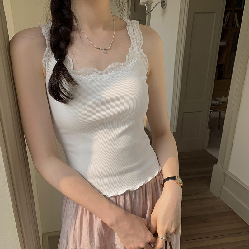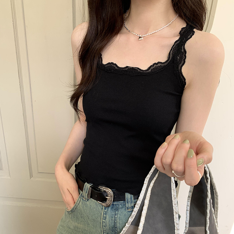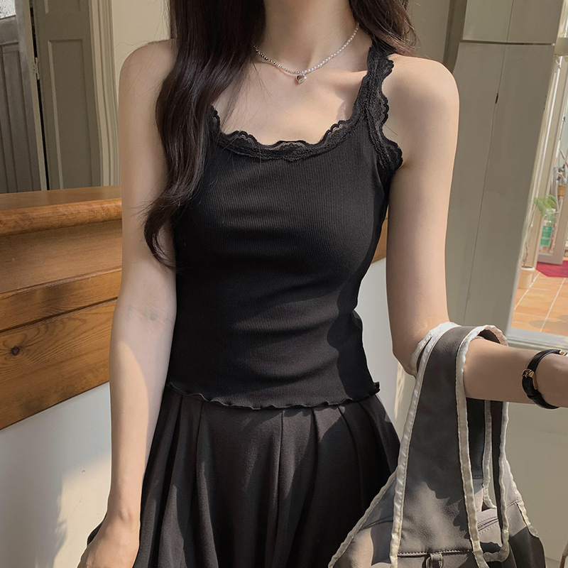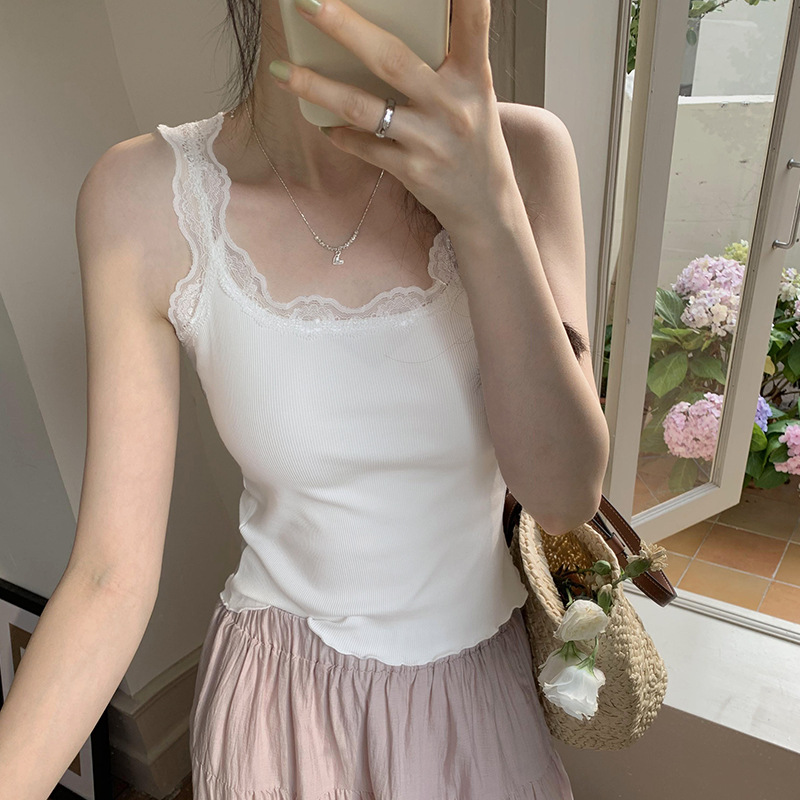 蕾丝花边拼接白色吊带背心女夏季新款性感辣妹修身短款打底衫上衣