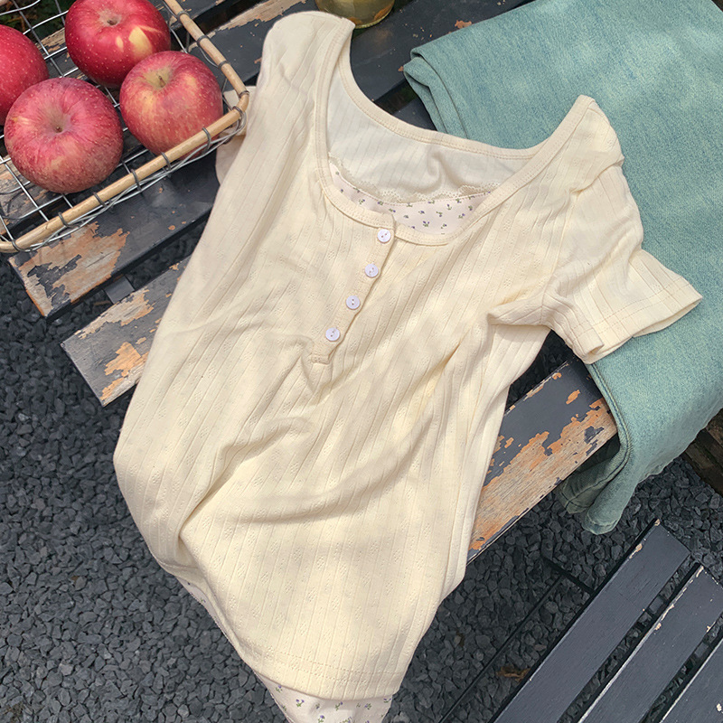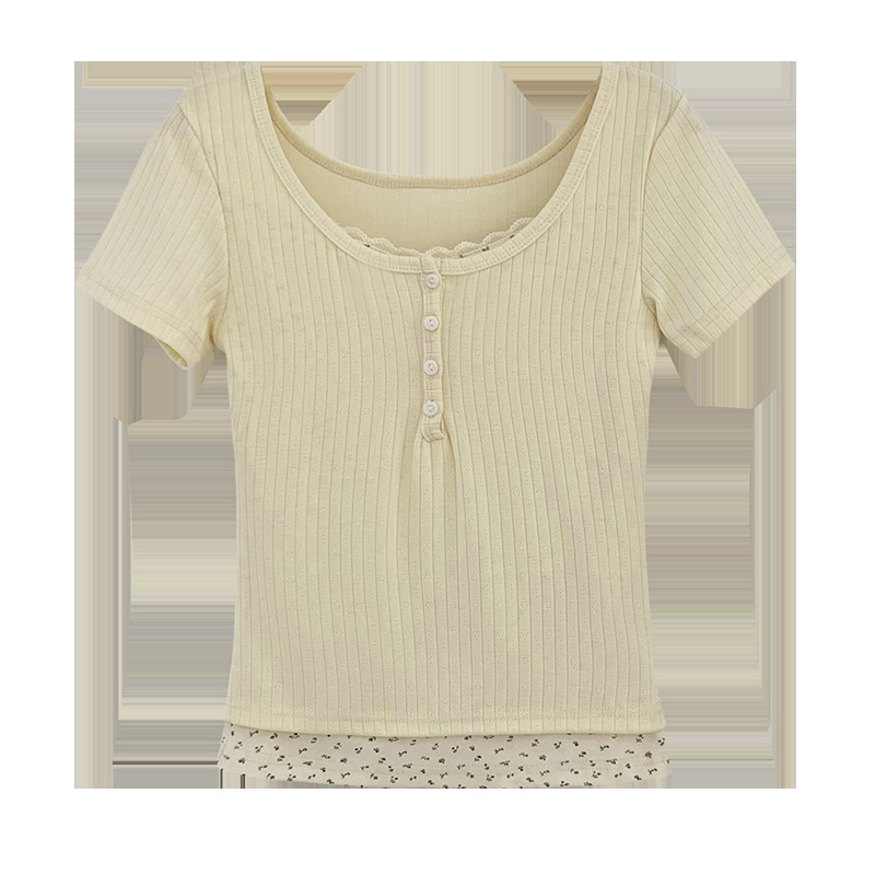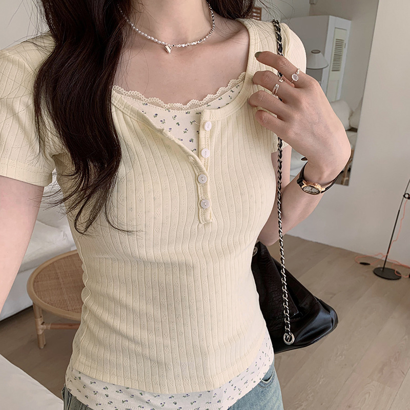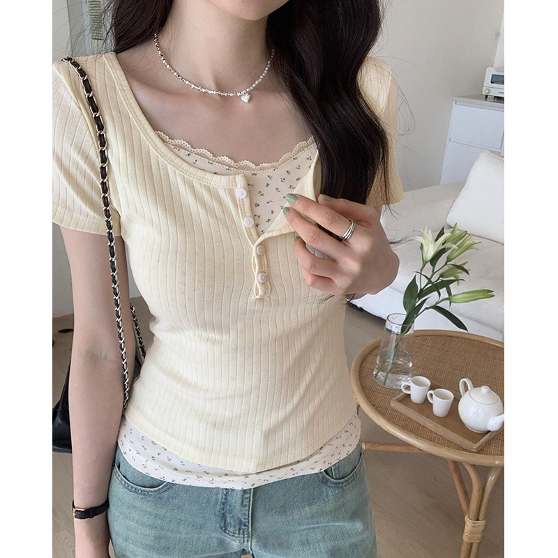 碎花蕾丝短袖t恤女夏季新款假两件纯欲绝美甜辣正肩短款上衣