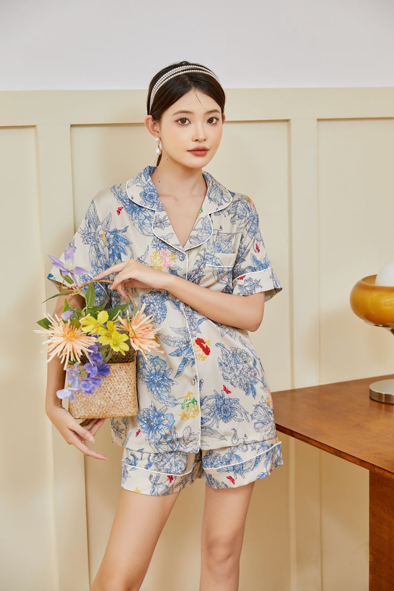 轻奢高定春秋季丝绸冰丝睡衣女莫奈花高级感印花夏季家居服套装女