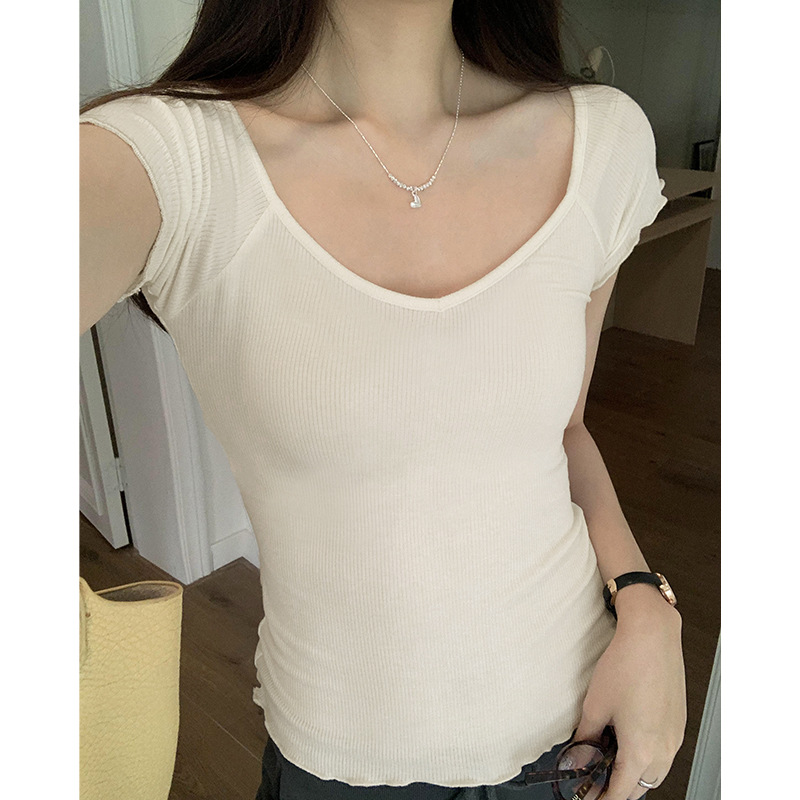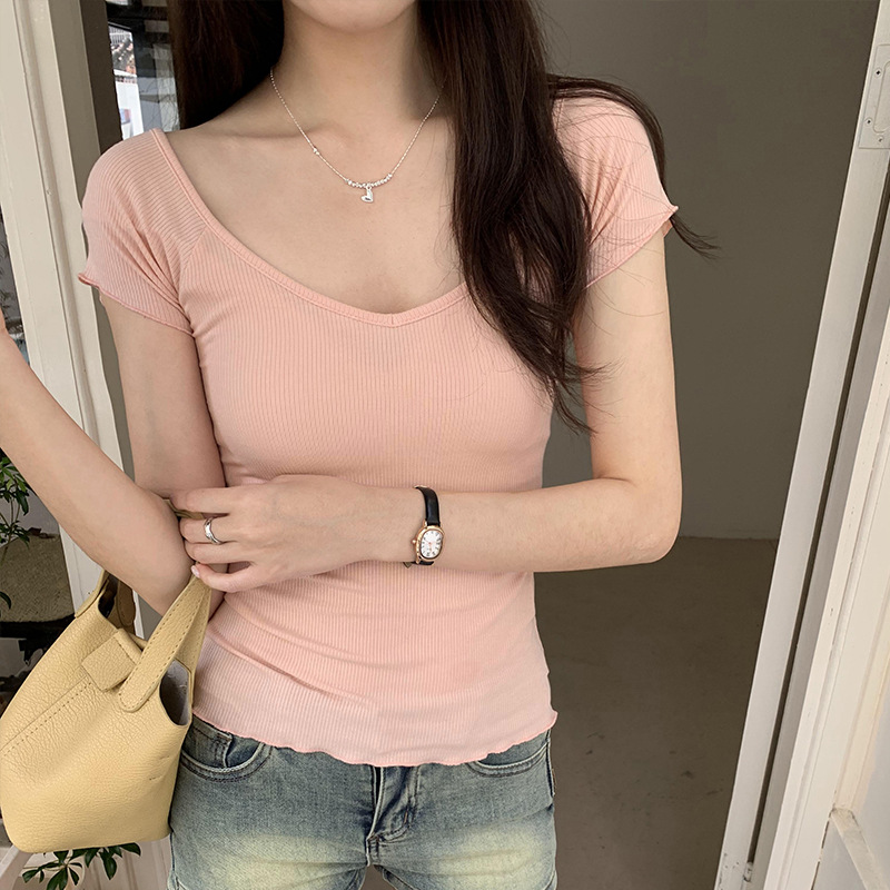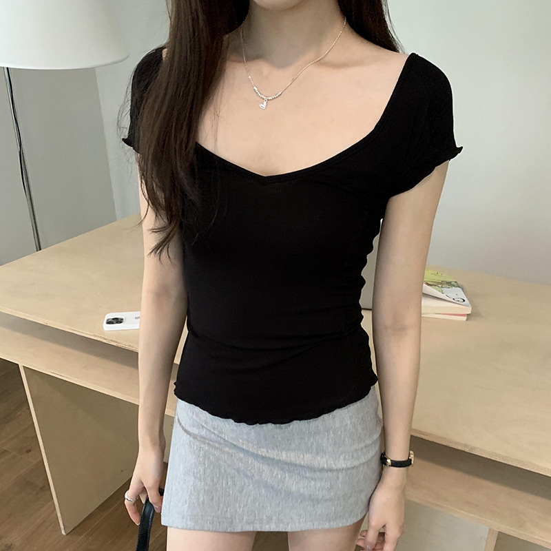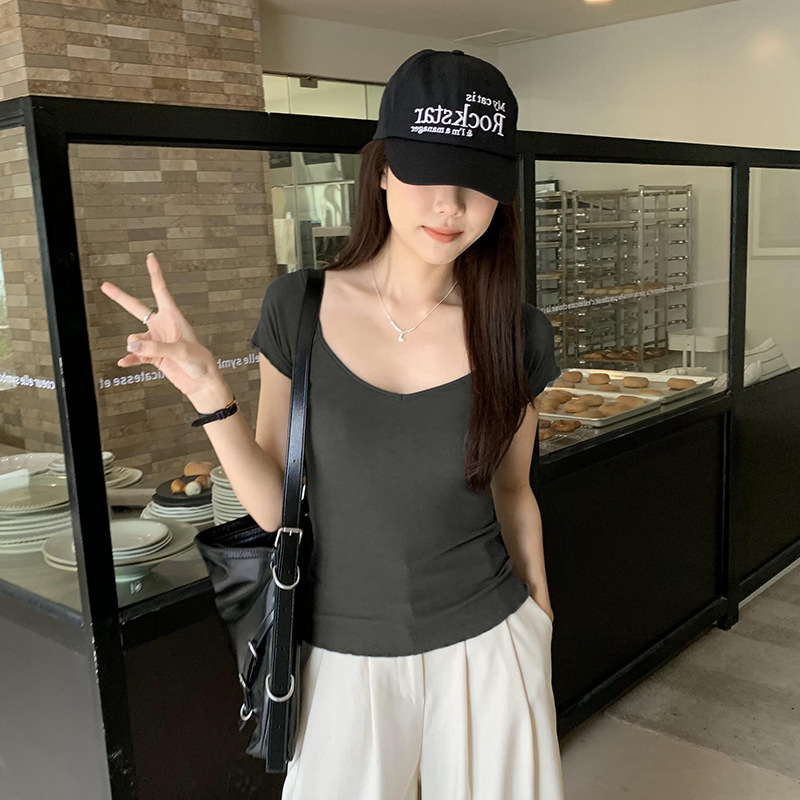 韩系设计感纯色V领短袖T恤女夏季新款辣妹纯欲修身显瘦上衣