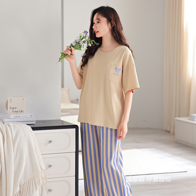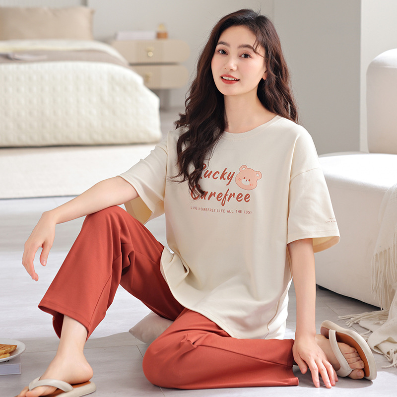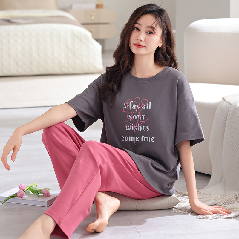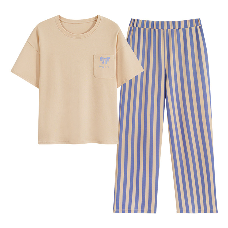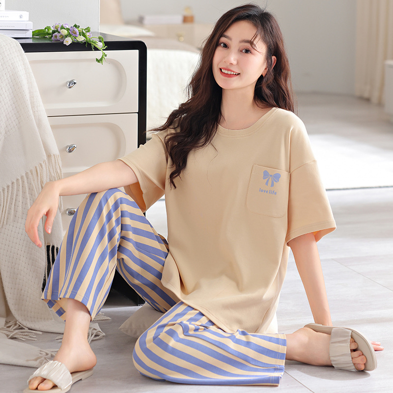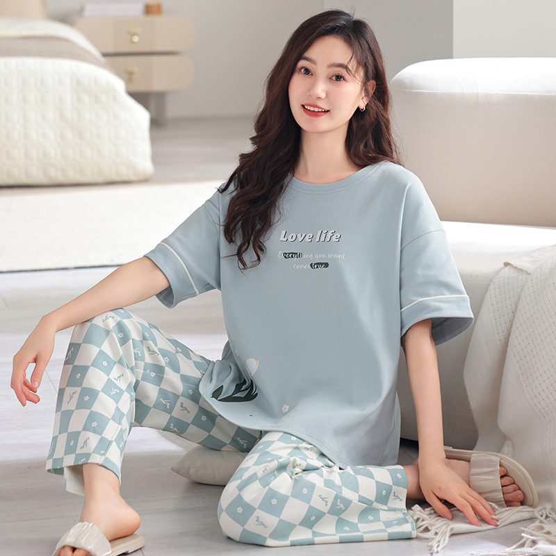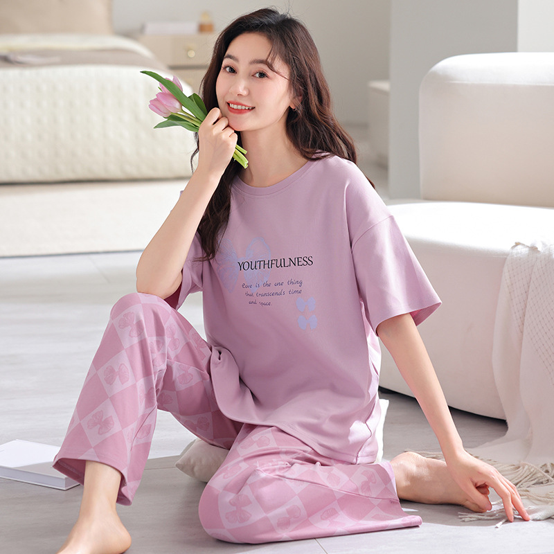 年新款睡衣女夏季纯棉短袖长裤休闲少女士100%全棉家居服夏天