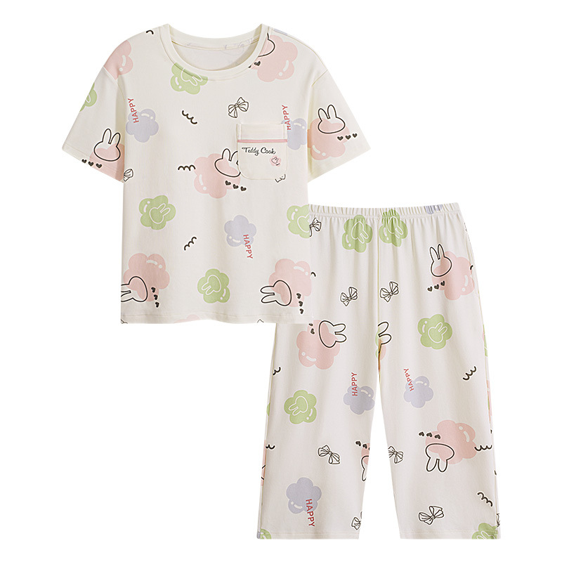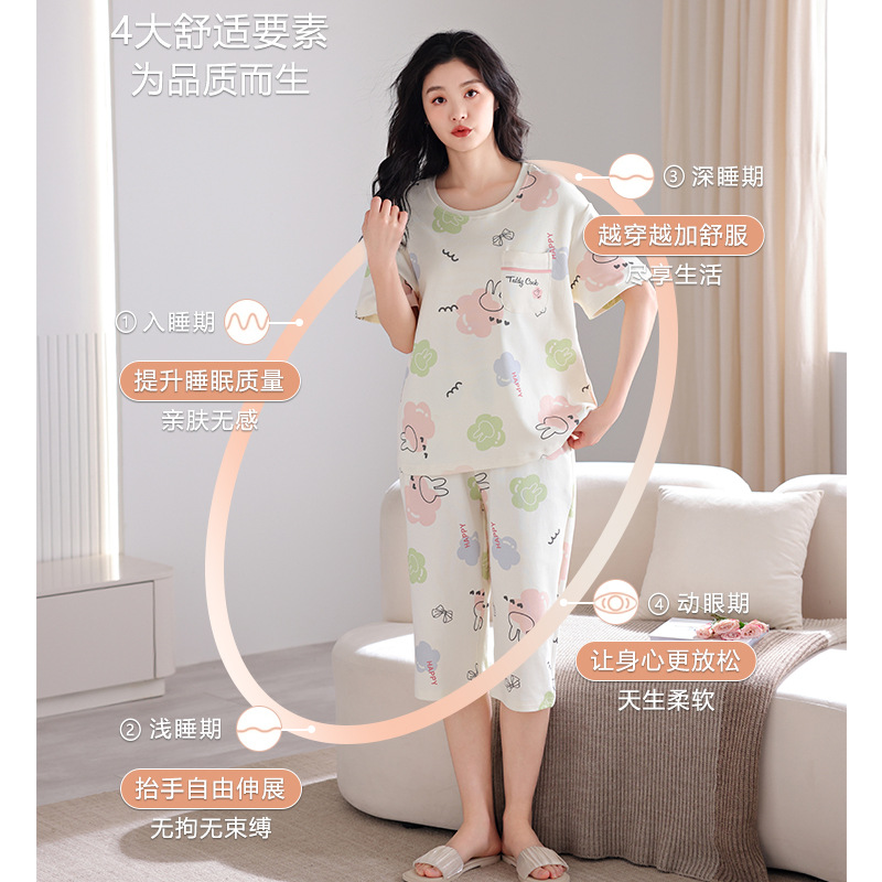 年新款睡衣女夏季纯棉短袖七分裤休闲可外穿带胸垫一体家居服