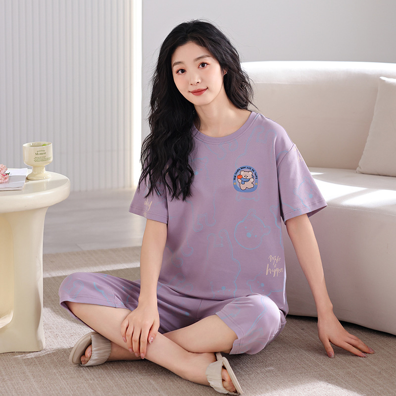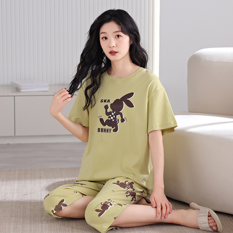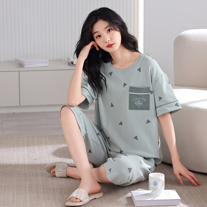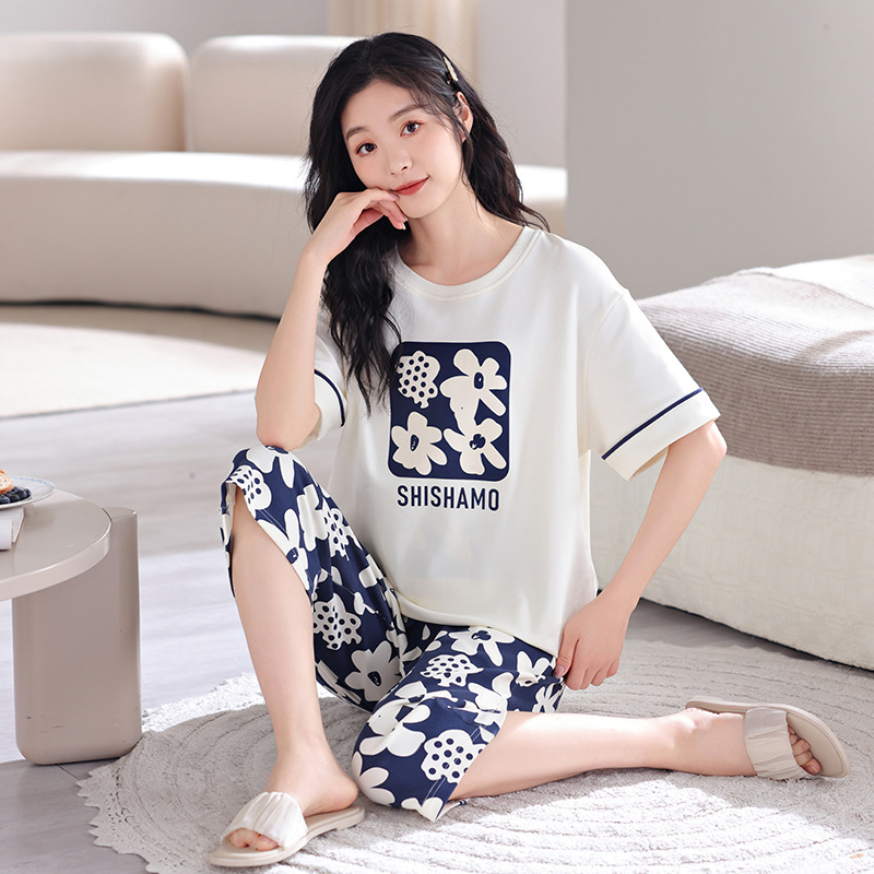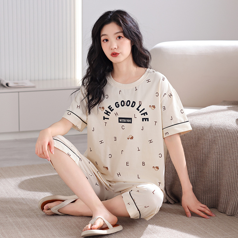 睡衣女士夏季纯棉短袖七分裤可外穿休闲全棉家居服年新款套装