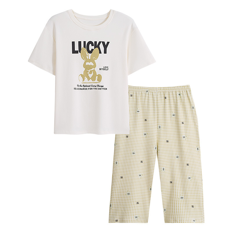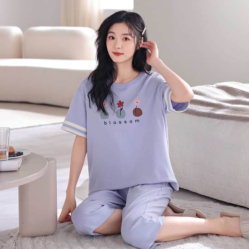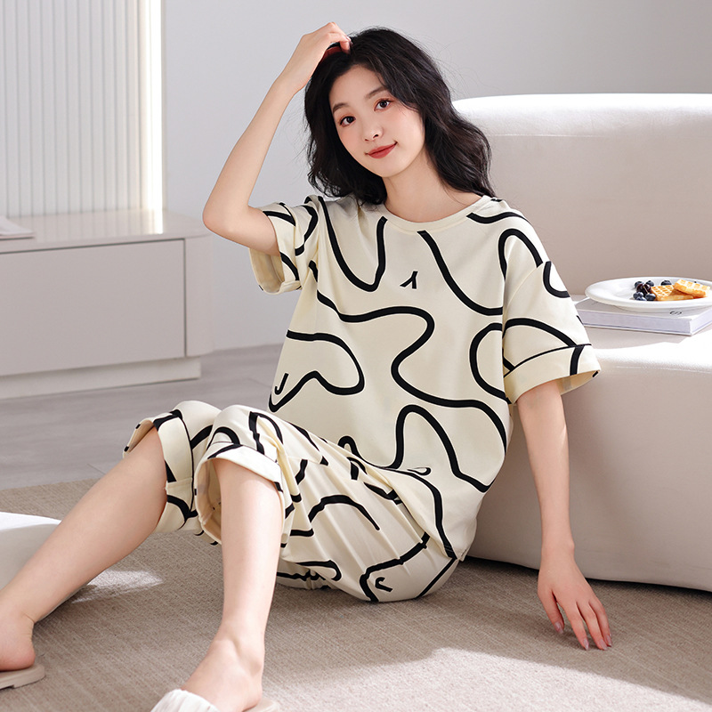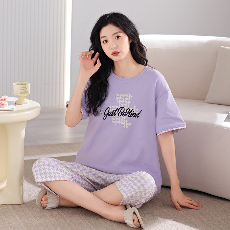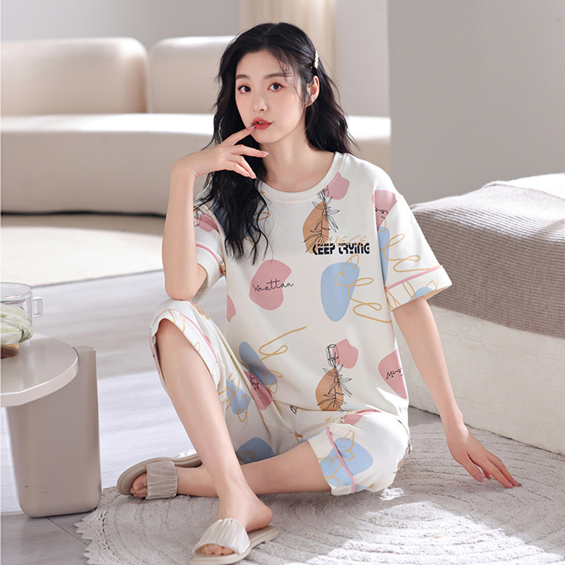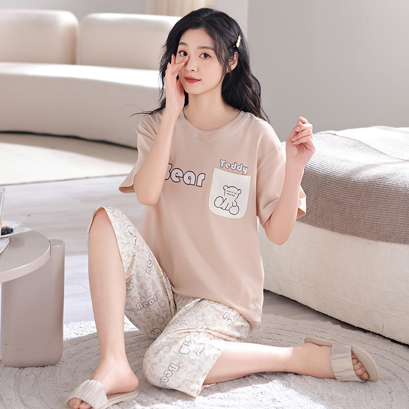 睡衣女士夏季纯棉短袖七分裤可外穿休闲全棉家居服年新款套装