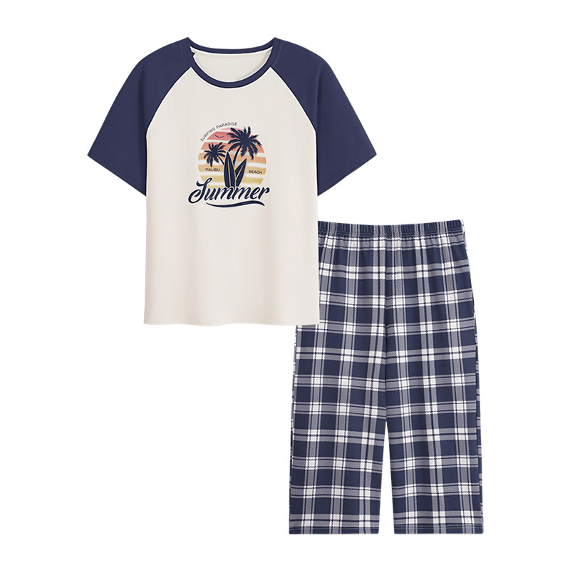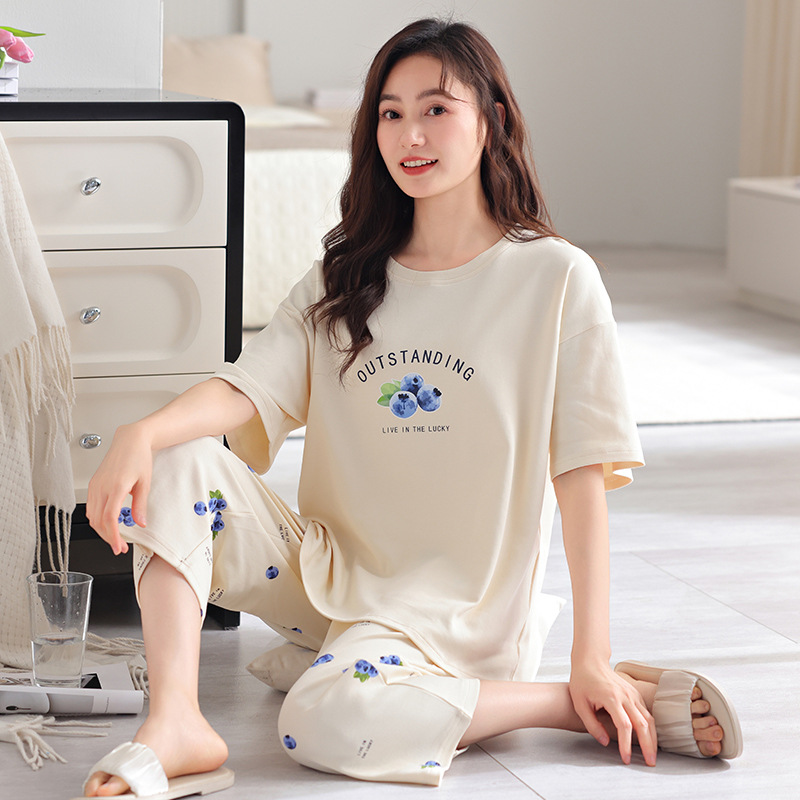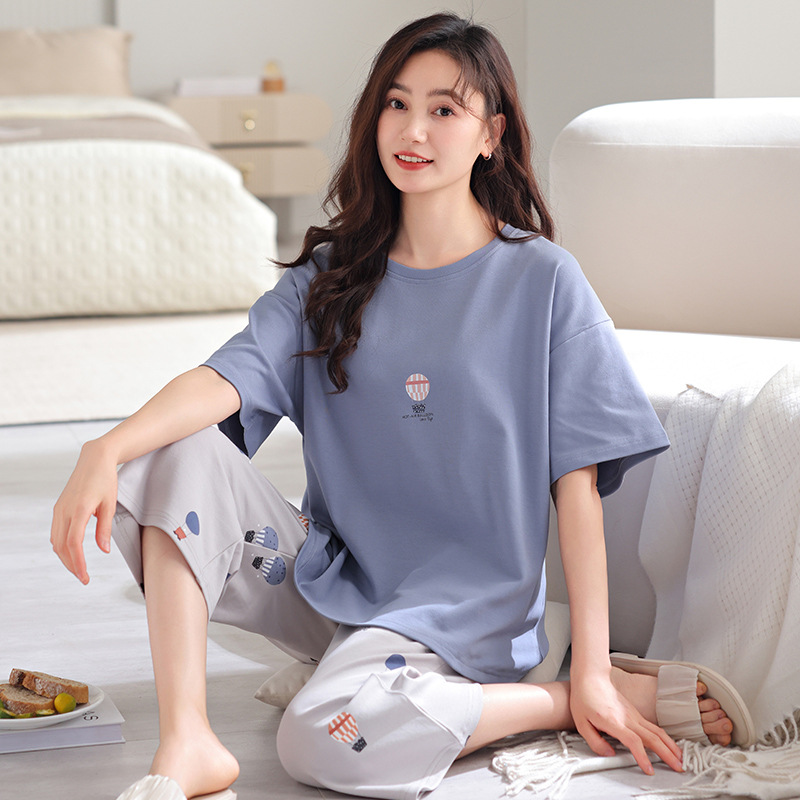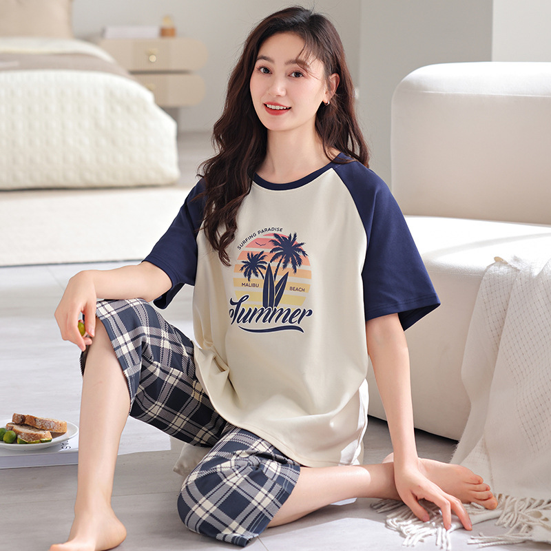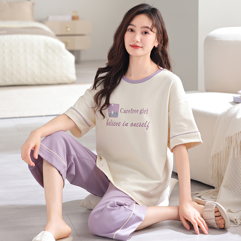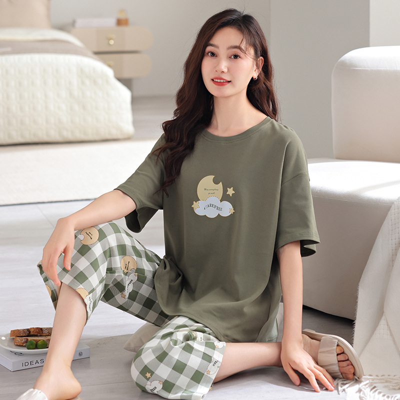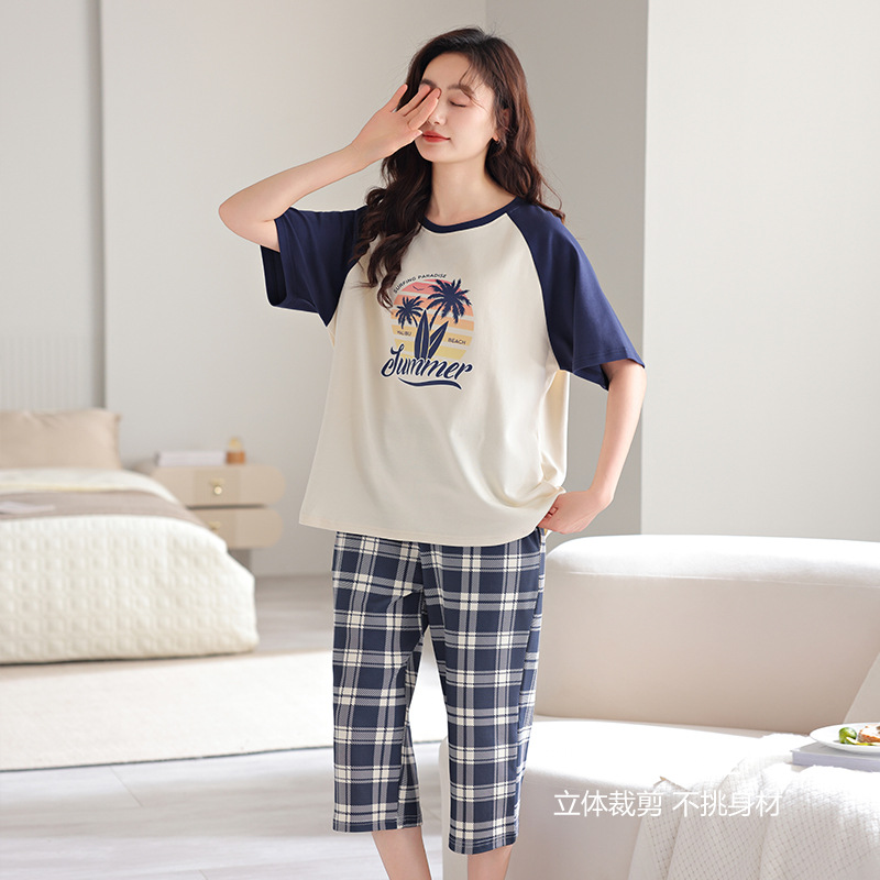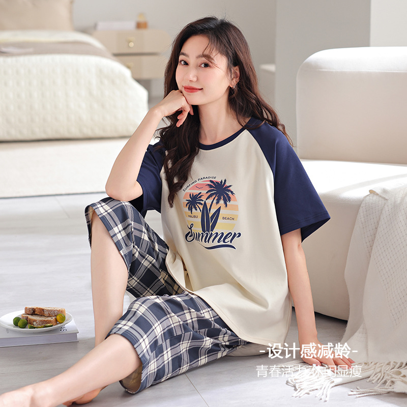 纯棉睡衣女士夏季短袖七分裤休闲套头可外穿全棉家居服年新款