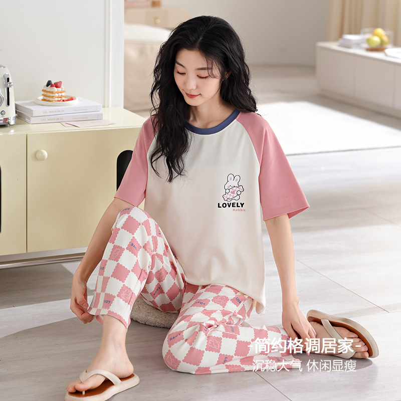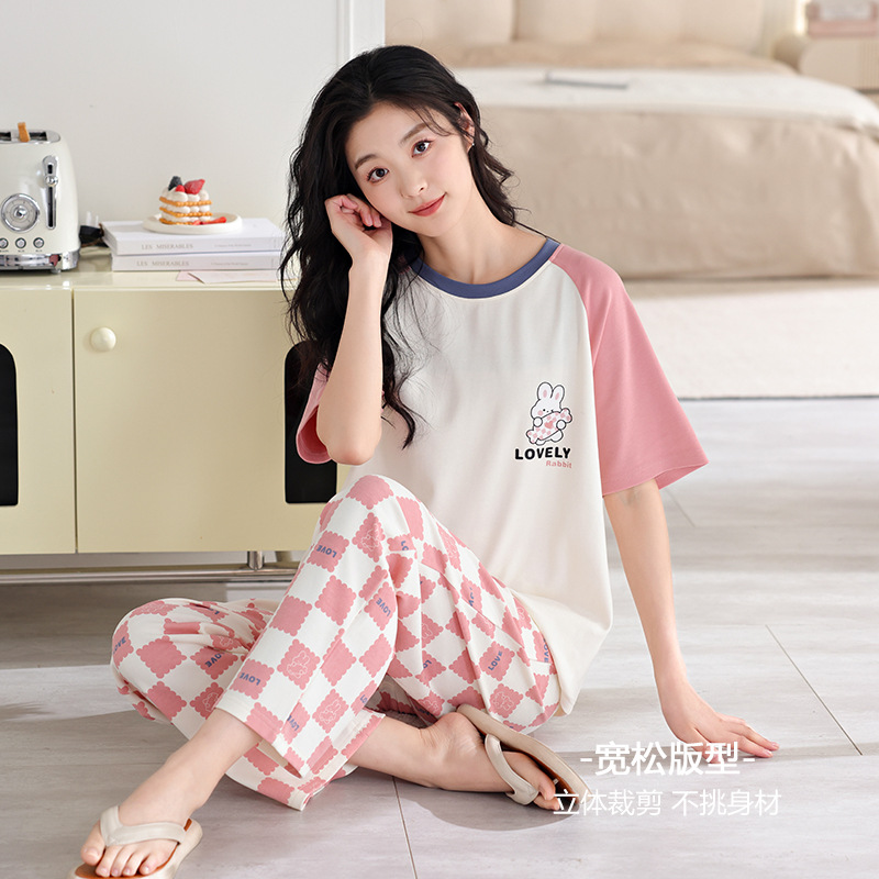 年新款睡衣女夏季纯棉短袖长裤可爱少女士休闲套头家居服套装