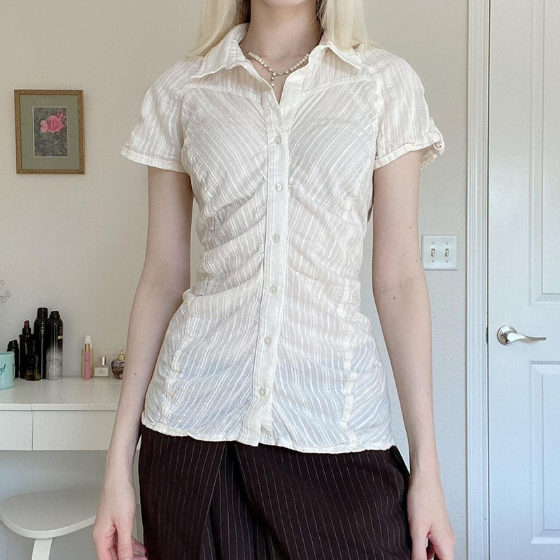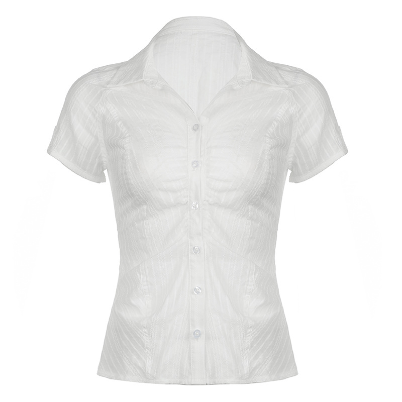 法式肌理褶皱排扣POLO领衬衫女纯色百搭开衫收腰修身短袖休闲上衣