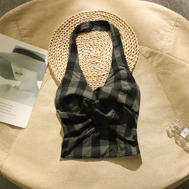法式复古v领扭结挂脖格子吊带背心女夏季甜辣风性感修身无袖上衣