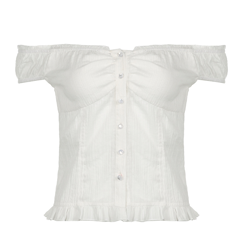 新款法式一字领蕾丝边两穿短袖T恤女甜辣木耳边排扣设计条纹上衣
