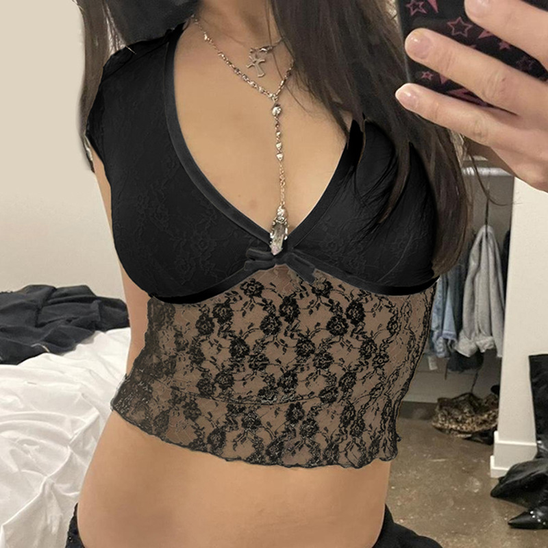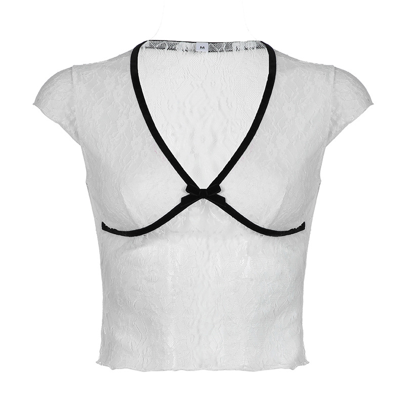 撞色V领拼蕾丝上衣女简约蝴蝶结胸型设计套头打底衫露脐短袖T恤夏