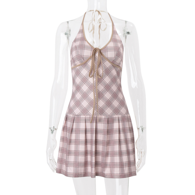 ins欧美风夏季新款性感甜辣V领绑带撞色格子印花挂脖连衣裙女