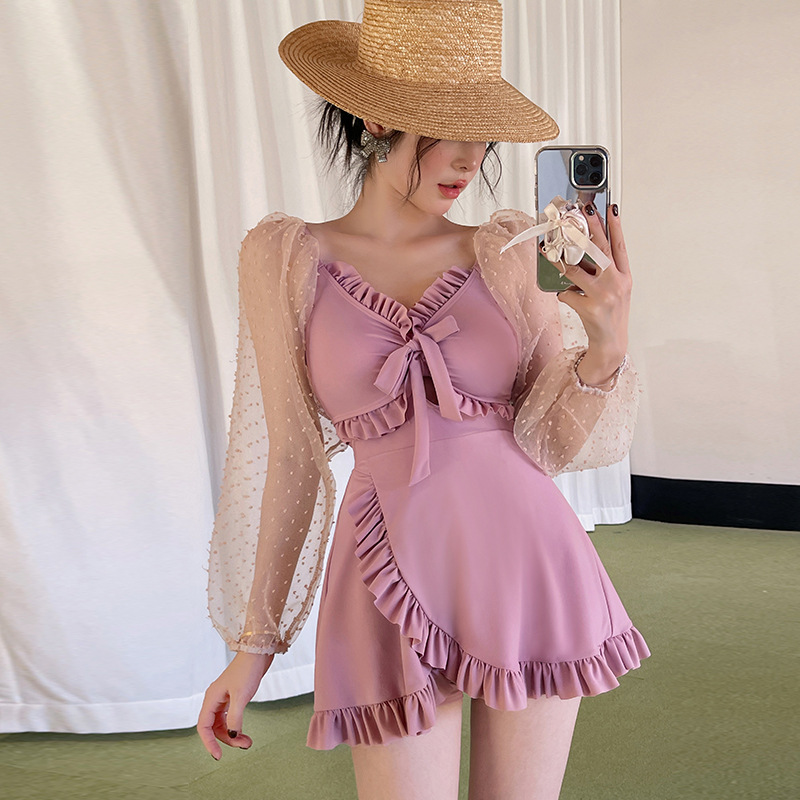 新款泳衣女性感纯欲纯色长袖防晒清新可爱遮肚显瘦沙滩泳装