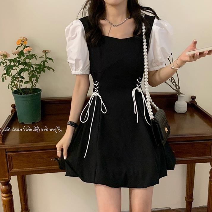 茶歇法式森系赫本风黑色泡泡袖连衣裙子女夏季小众设计绑带蓬蓬裙