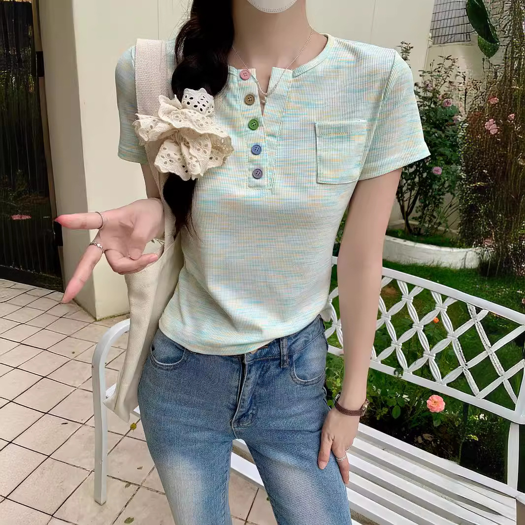 薄荷绿渐变纽扣v领正肩短袖t恤衫女装夏季打底衫单穿修身显瘦上衣