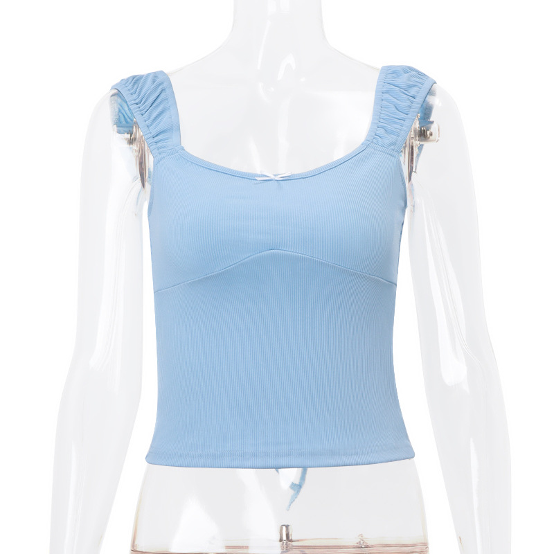 ins欧美风春夏甜辣方领露背绑带螺纹修身泡泡袖短袖上衣T恤女