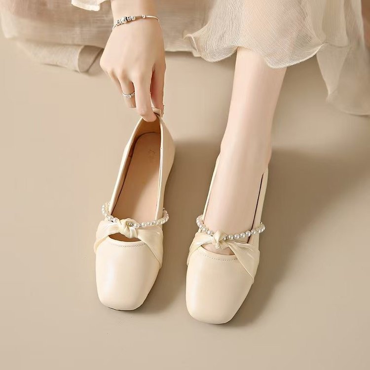 法式温柔风单鞋女春平底2025新款珍珠瓢鞋软底豆豆鞋方头浅口女鞋