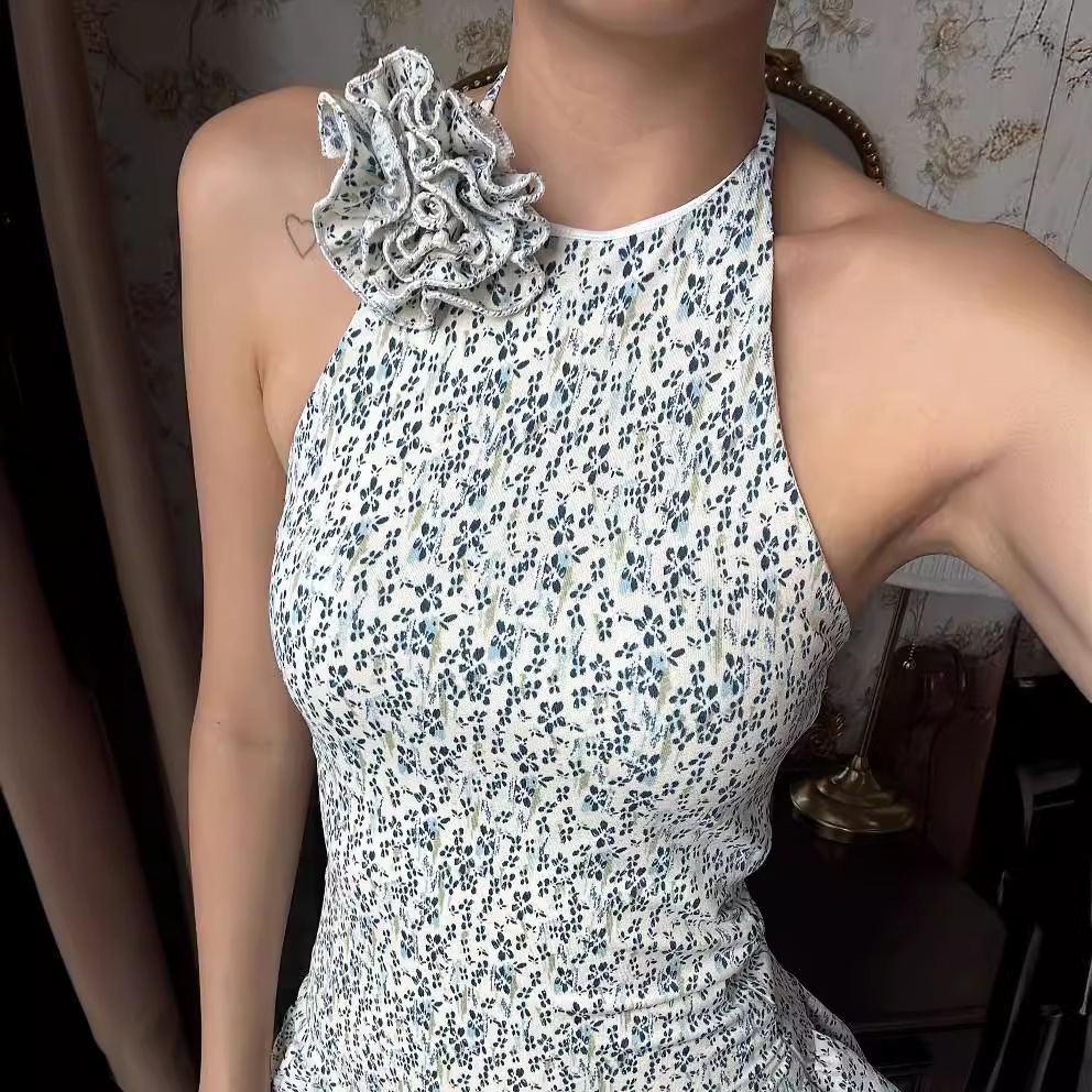 INS欧美风春夏新款性感碎花挂脖连衣裙女气质甜美初恋小裙子