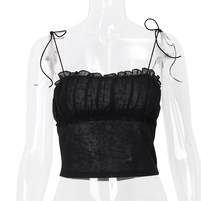 夏季新款性感辣妹褶皱花边挂脖系带短款外穿背心女