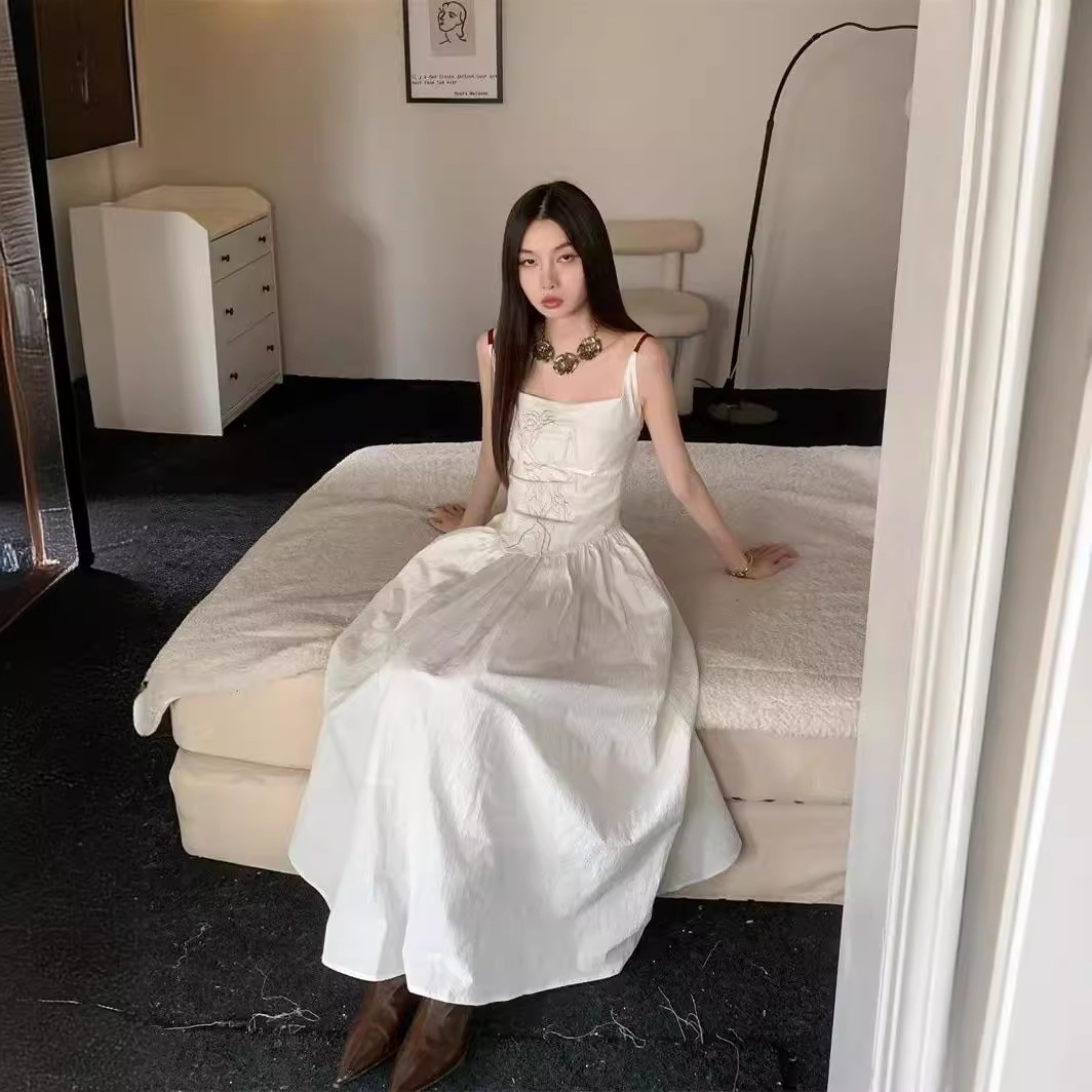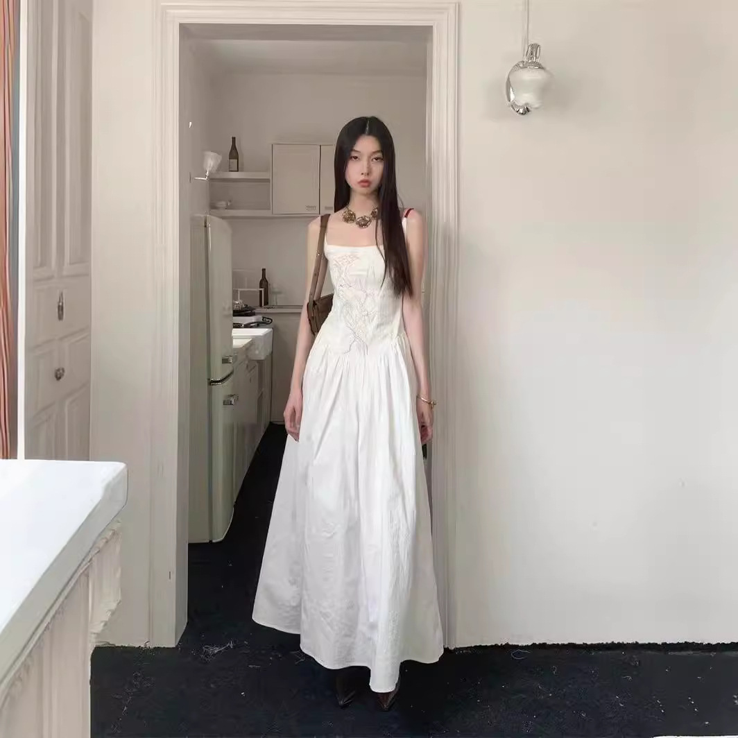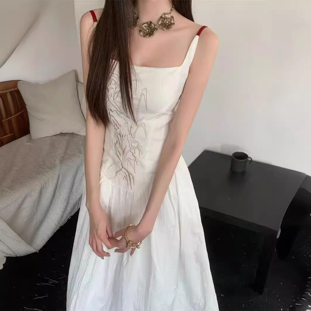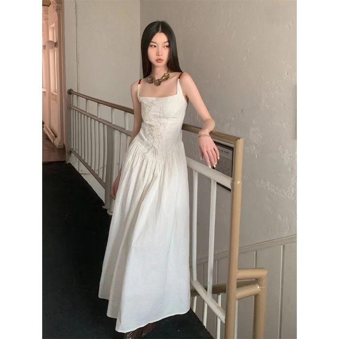 夏季年新款新中式刺绣棉质长款露背收腰显瘦吊带度假连衣裙女