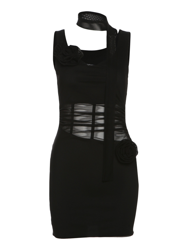 欧美风春季新款女装纯色修身高腰时尚V领吊带纱网连衣裙