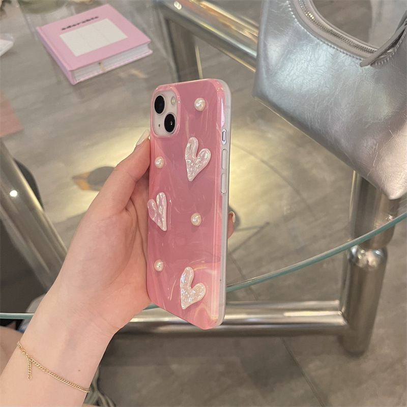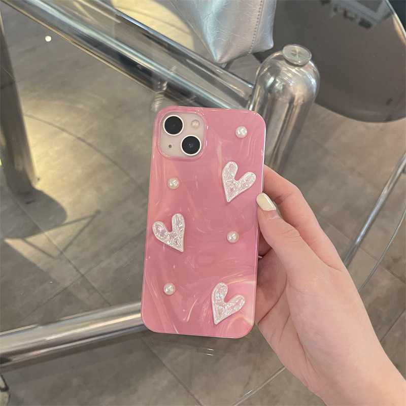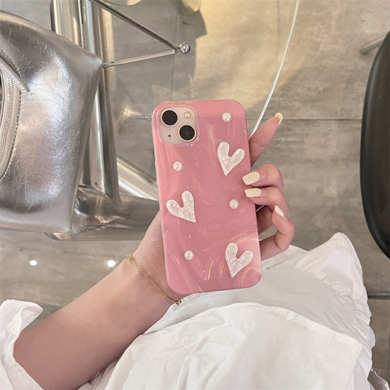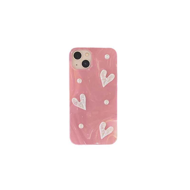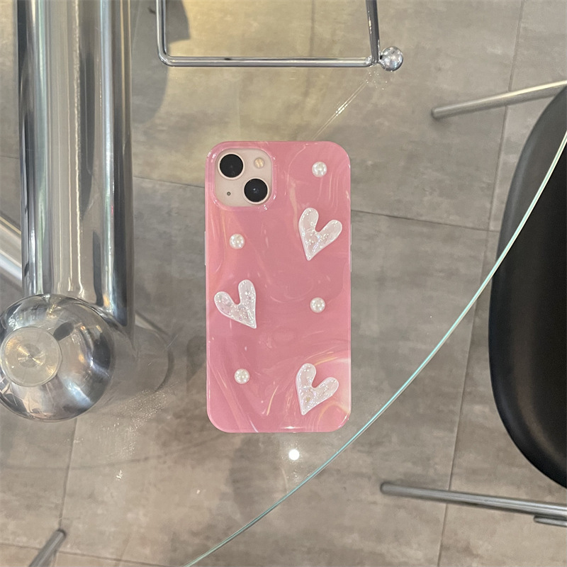 粉色晕染珍珠镭射爱心适用iPhone14promax手机壳苹果15全包13防摔