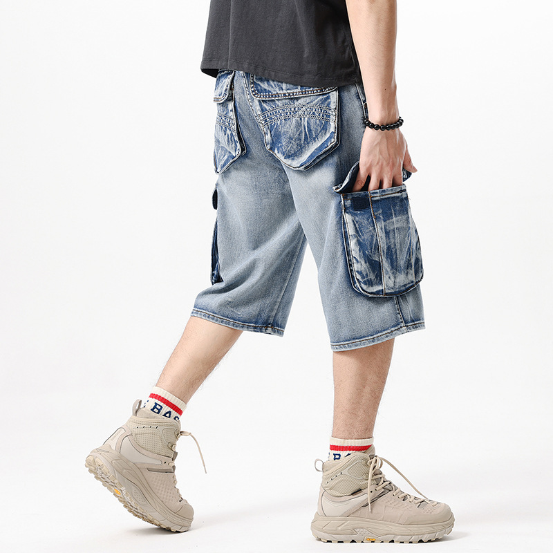 欧美多口袋牛仔裤宽松加肥加大码中裤男潮流嘻哈大码滑板裤男5分