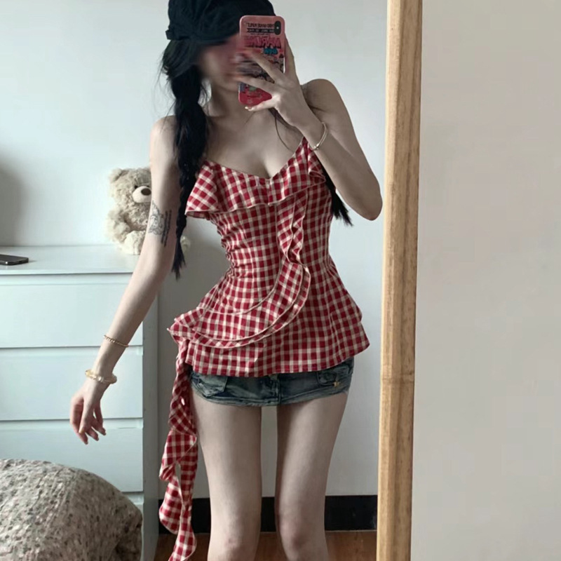 夏秋季新款红格甜辣妹不规则荷叶边飘带吊带修身显瘦无袖上衣女