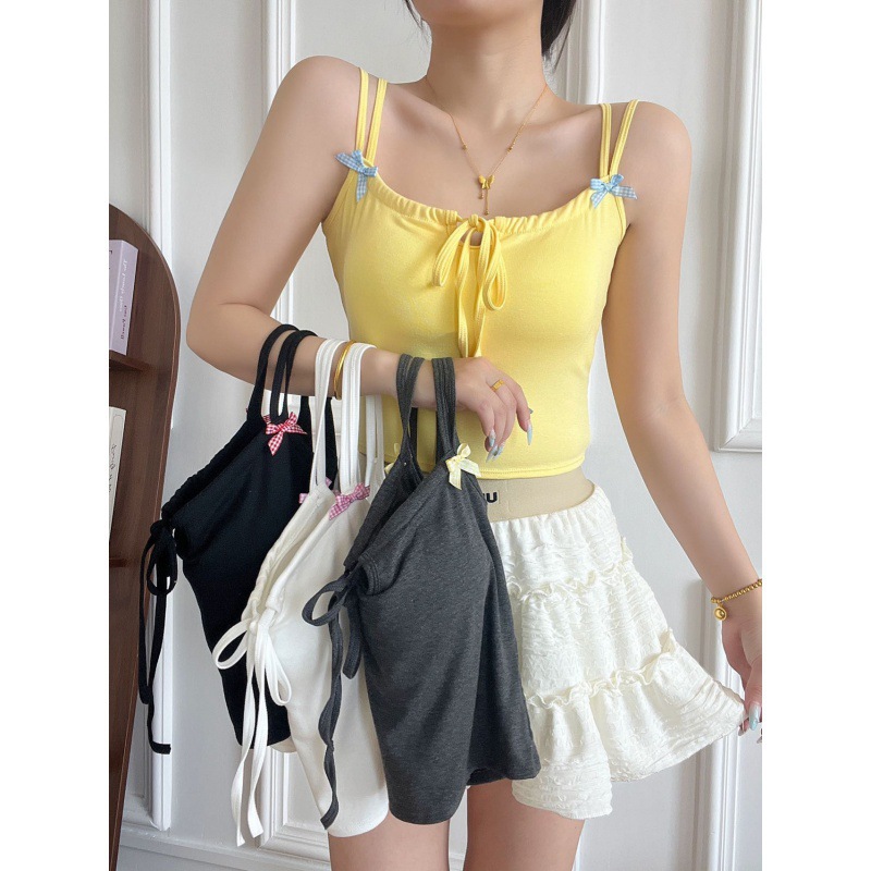 夏秋季新款奶黄色纯欲甜辣风吊带小背心女新款氛围感蝴蝶结上衣