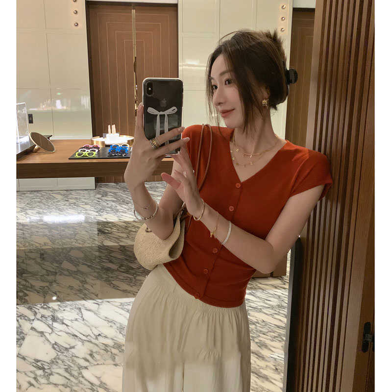夏秋季新款锁骨针织T恤新款打底针织衫V领开衫短款短袖上衣女
