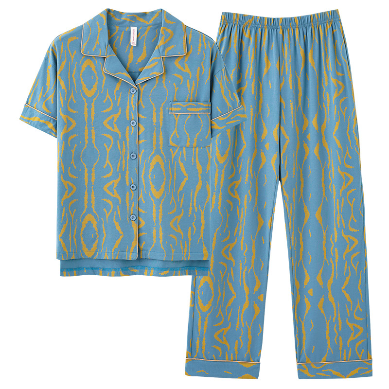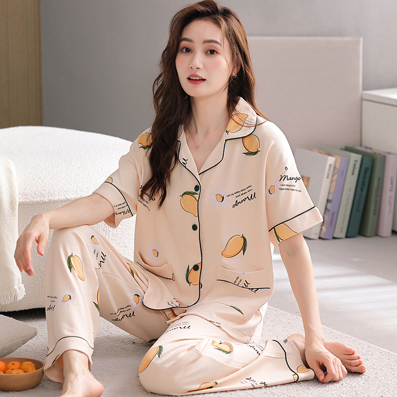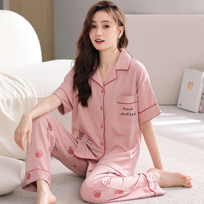纯棉睡衣女士夏季薄款开衫短袖长裤简约全棉可外穿大码家居服套装