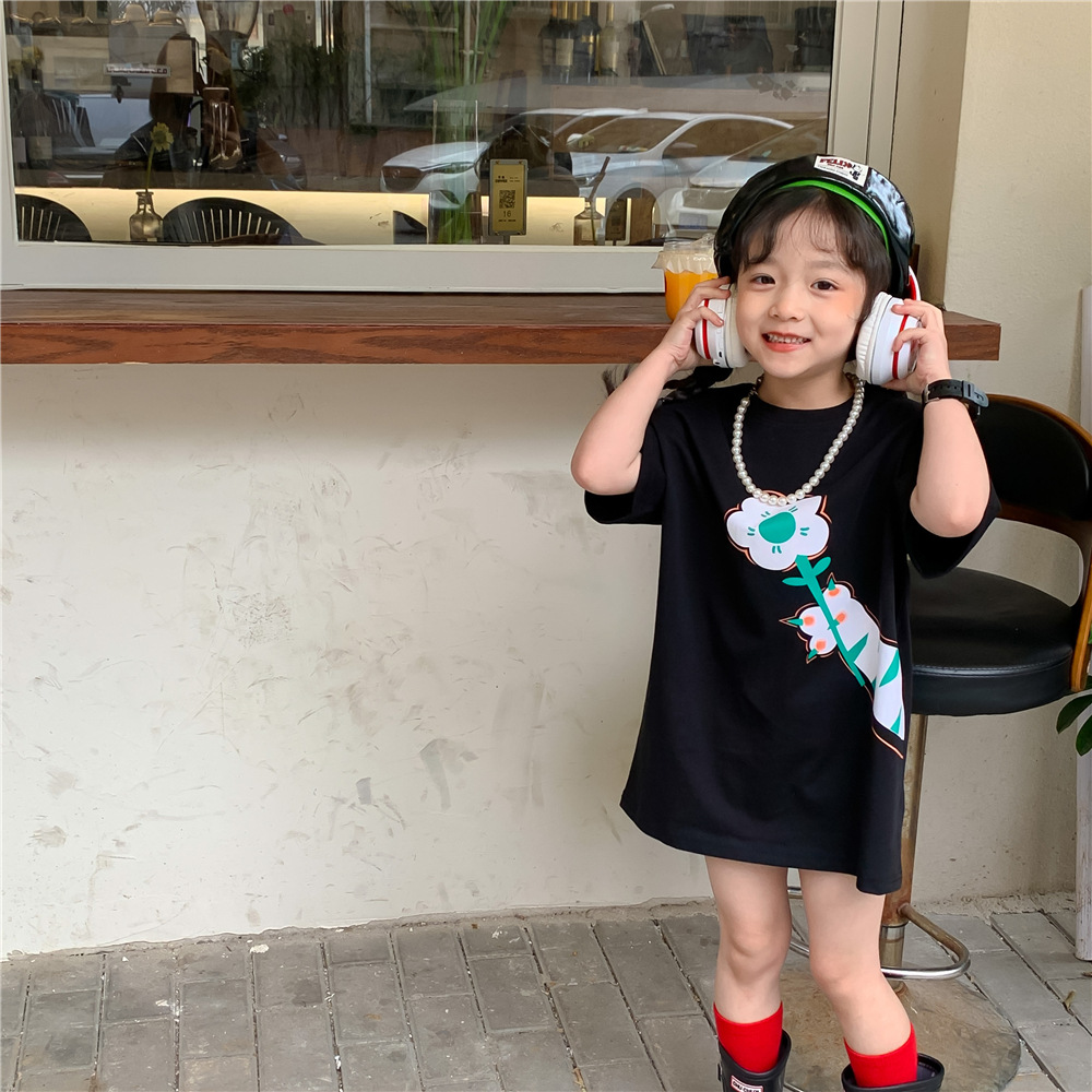夏季新款童装 女童洋气爪子献花T恤裙儿童宝宝中长卡通连衣裙