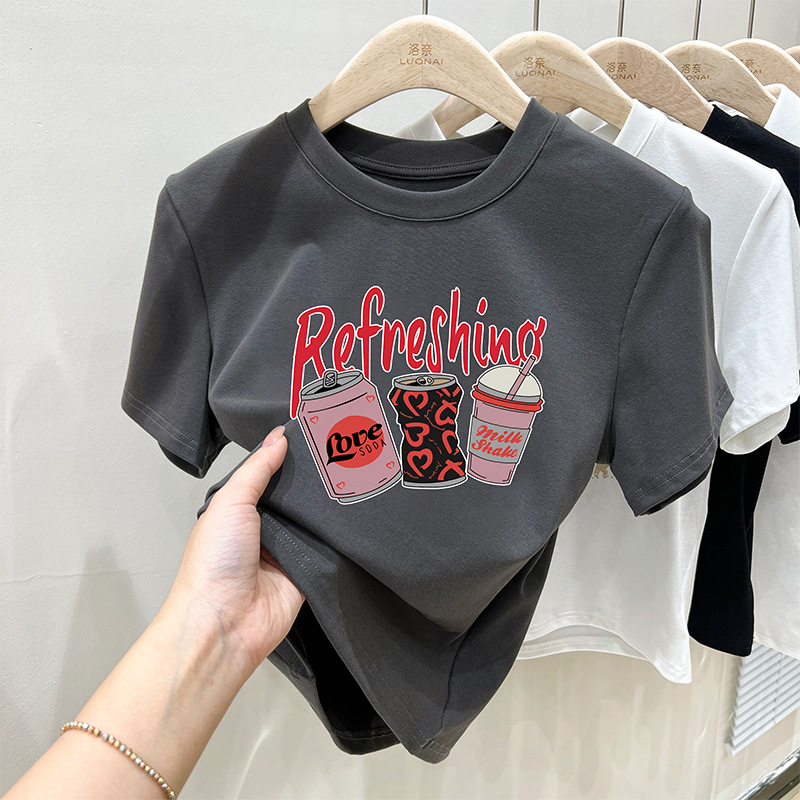 正肩短袖t恤女美式卡通短款修身显瘦体恤圆领辣妹上衣