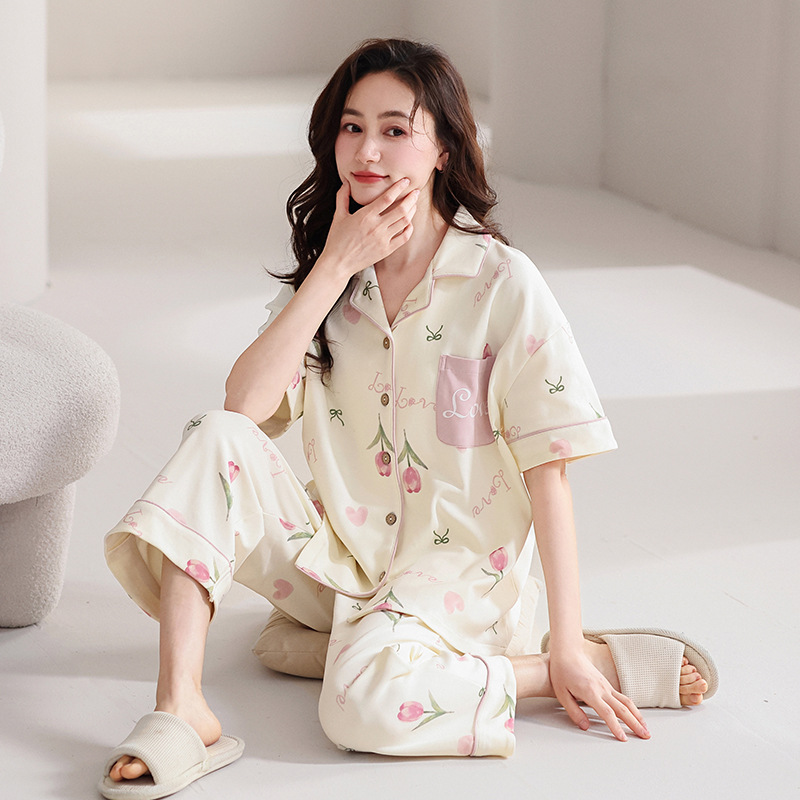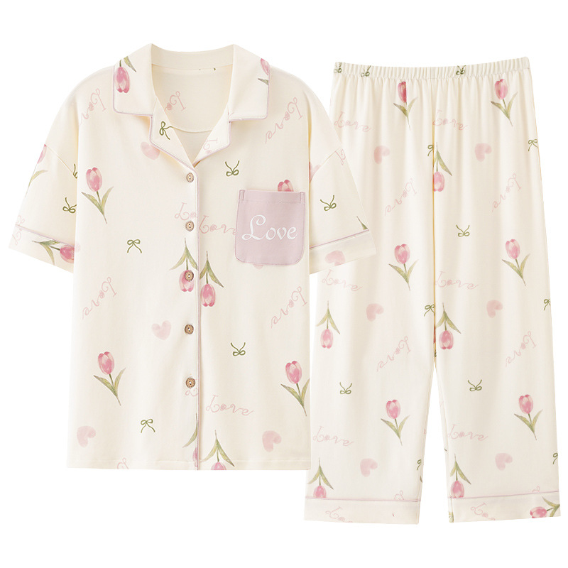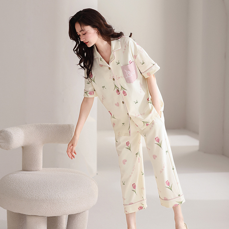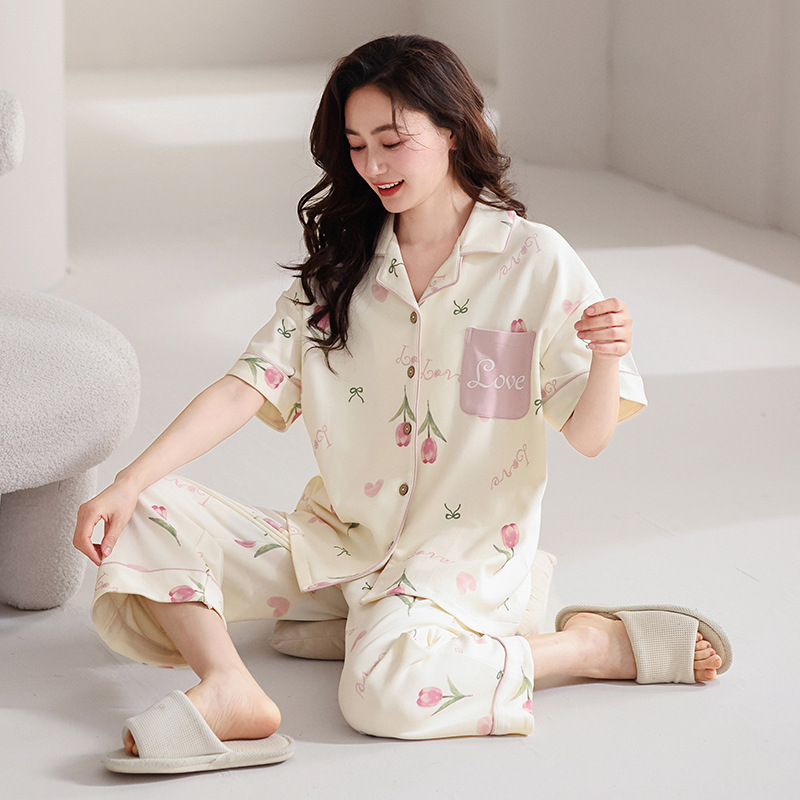 带胸垫睡衣女士夏季纯棉开衫短袖七分裤年新款休闲全棉家居服