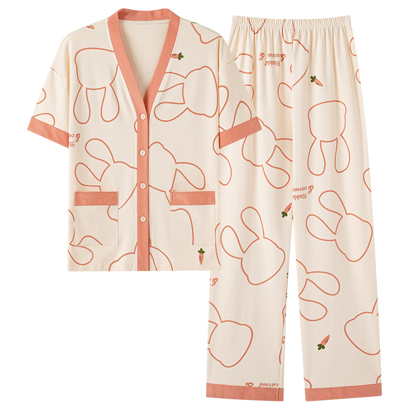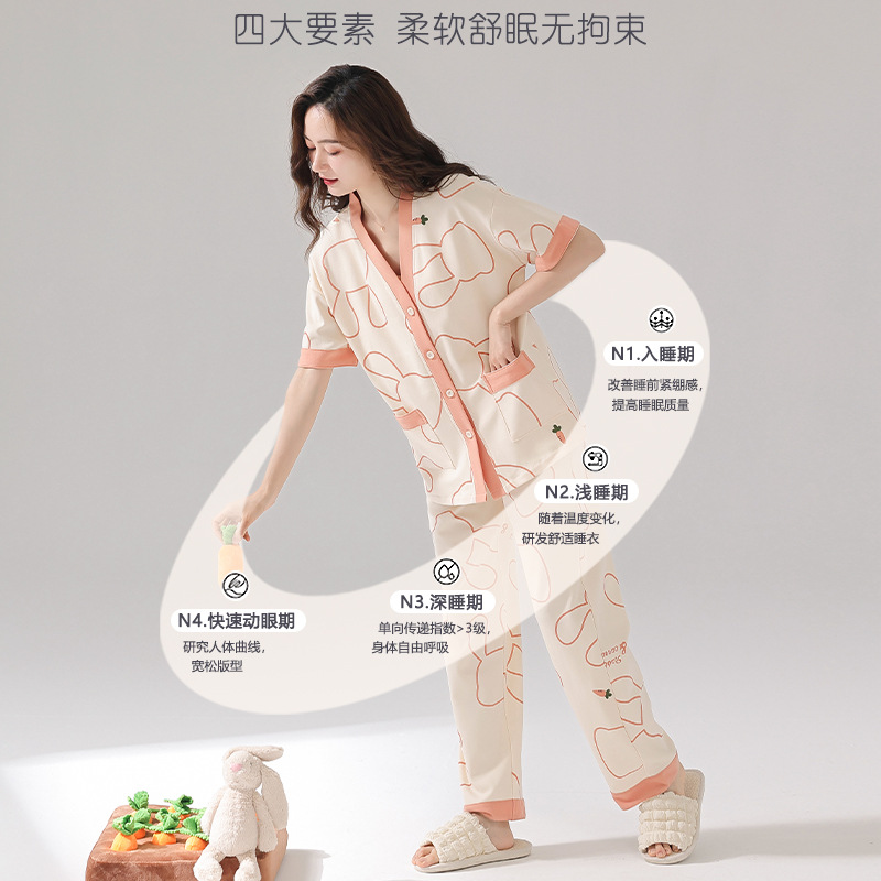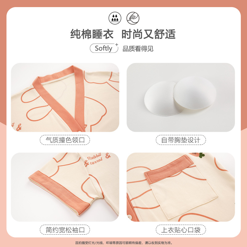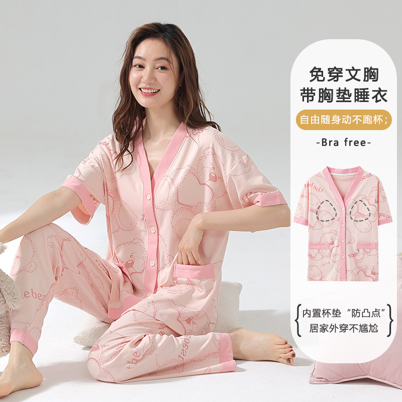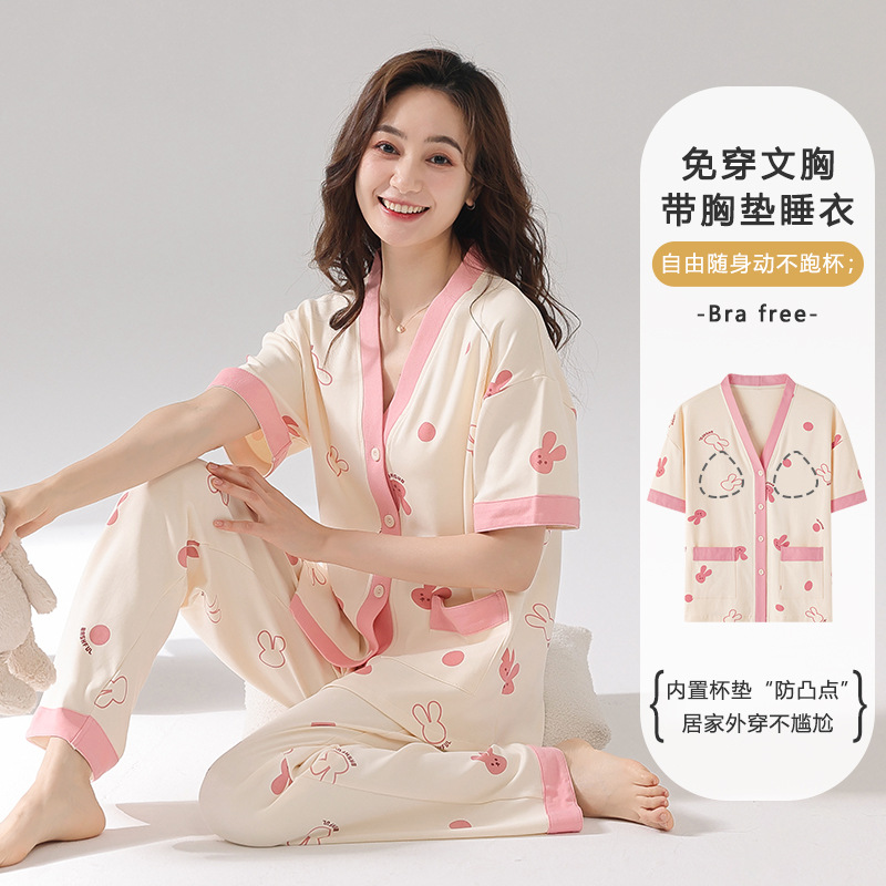 带胸垫一体睡衣女士夏季薄款纯棉短袖长裤开衫全棉外穿家居服套装