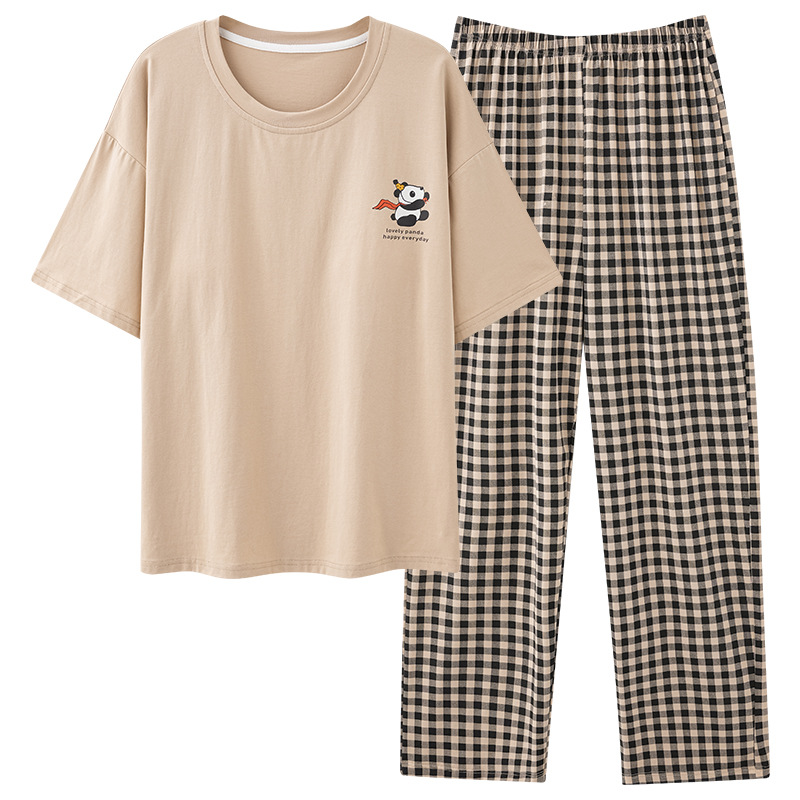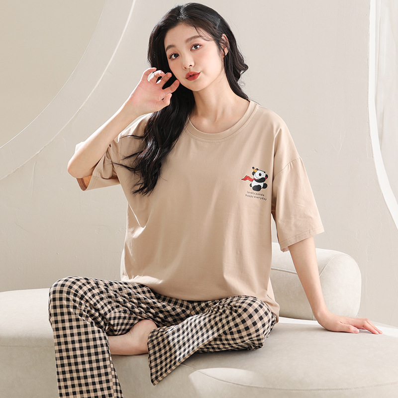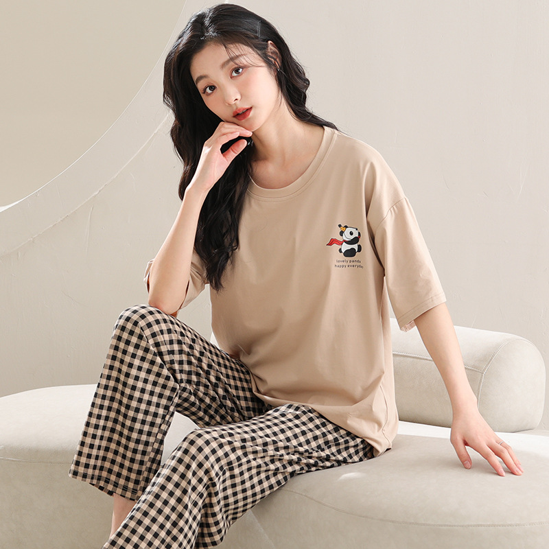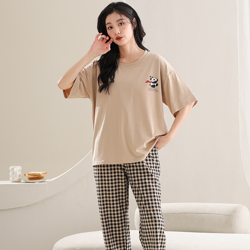 带胸垫一体睡衣女士夏季短袖长裤简约莫代尔套头家居服年新款