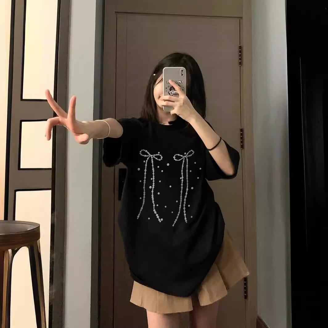 纯棉重磅蝴蝶结印花短袖t恤女新款夏季宽松慵懒风半袖上衣潮