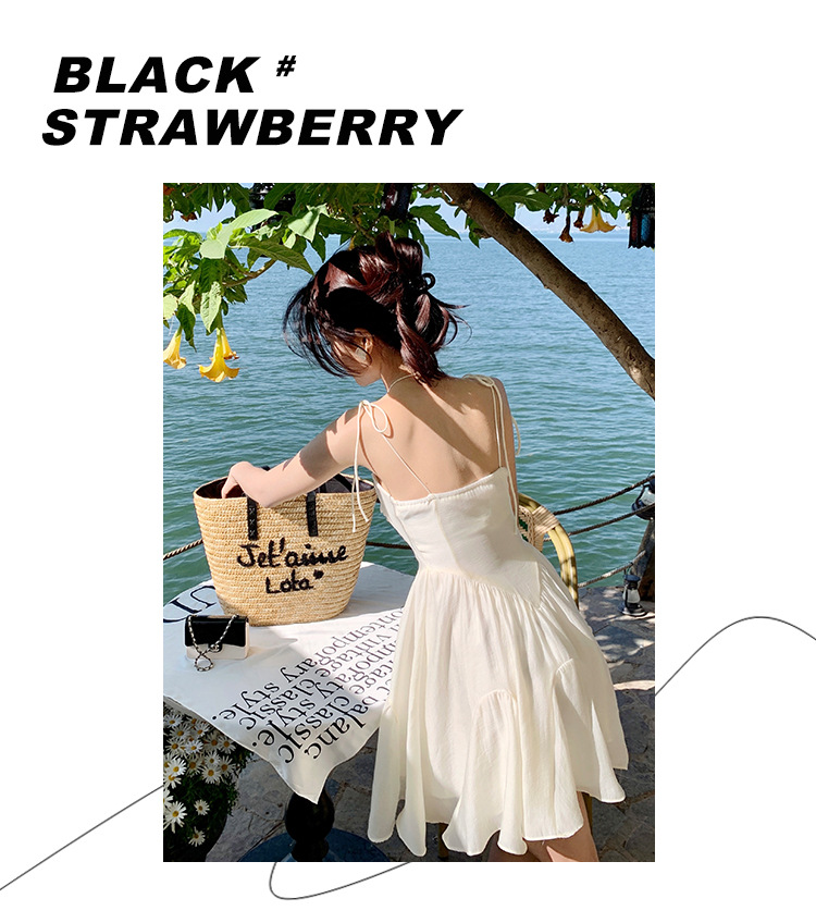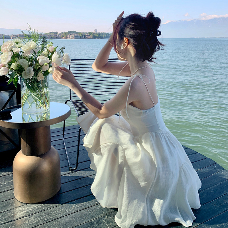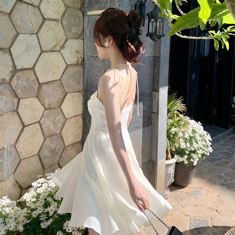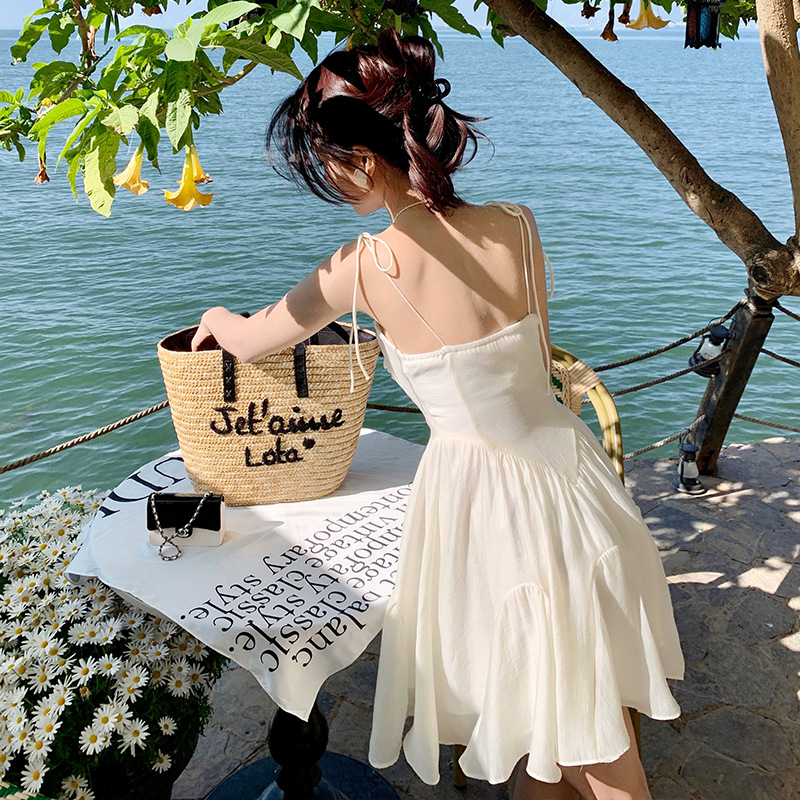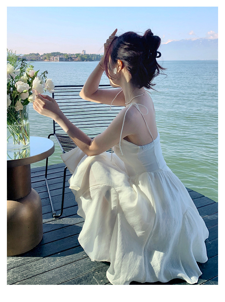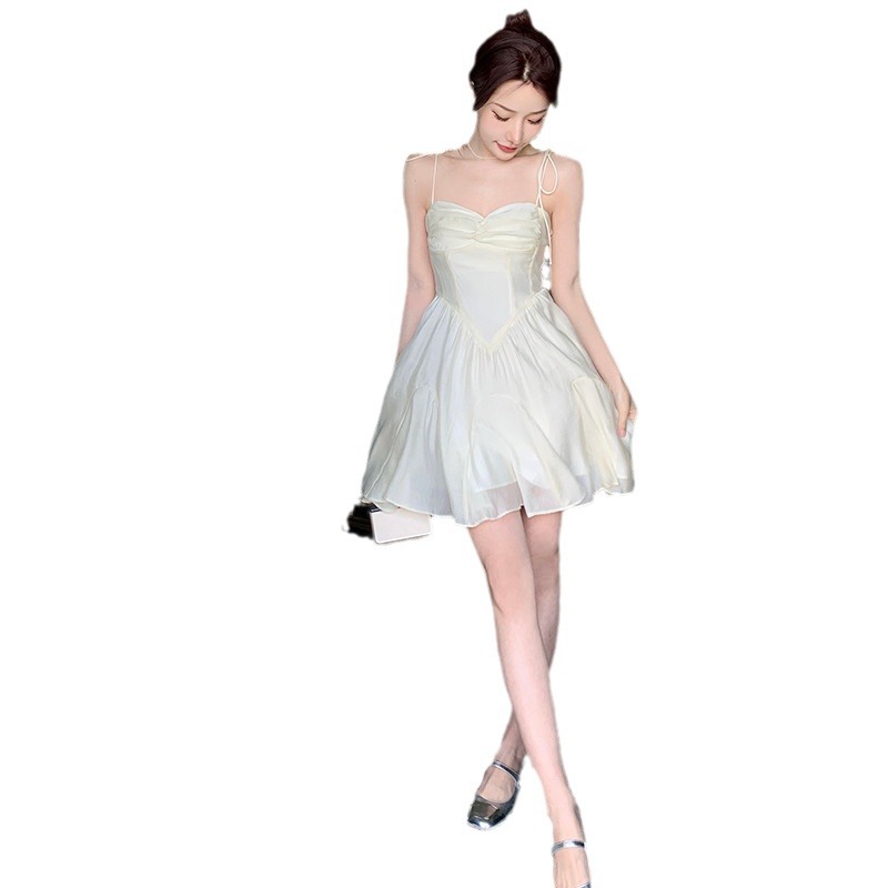 法式浪漫精致气质米色吊带裙蝴蝶结褶皱罩杯丝感吊带裙连衣裙