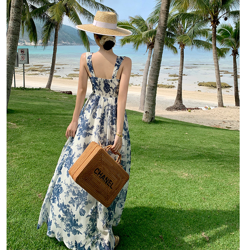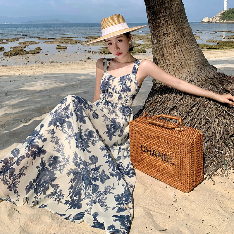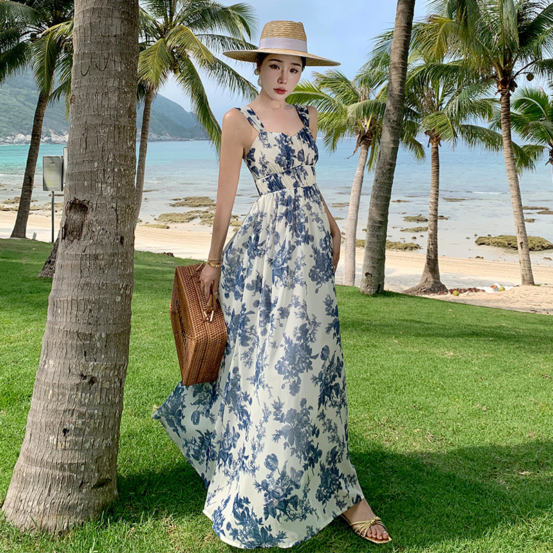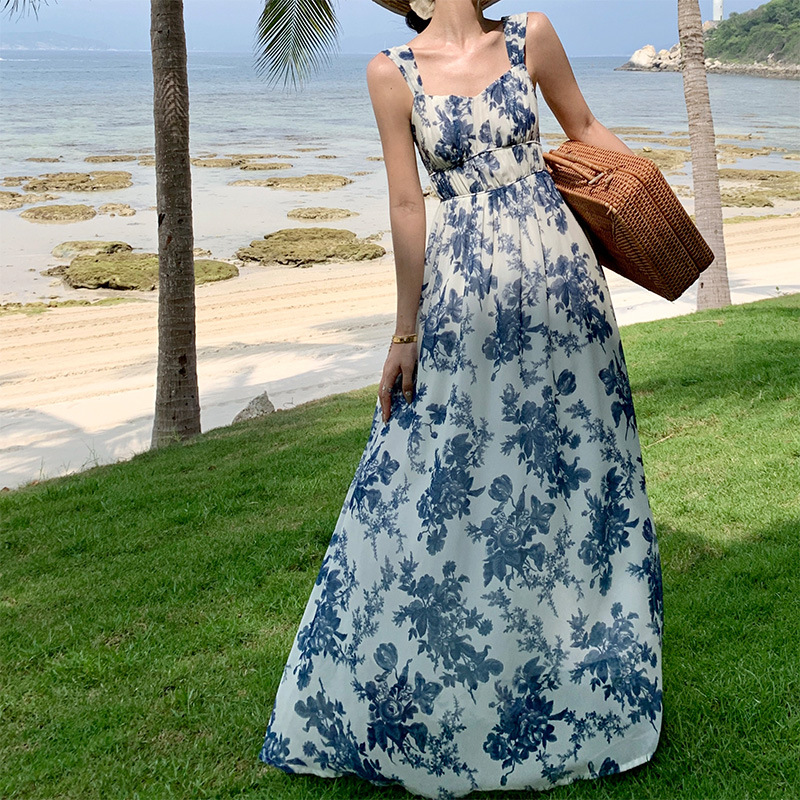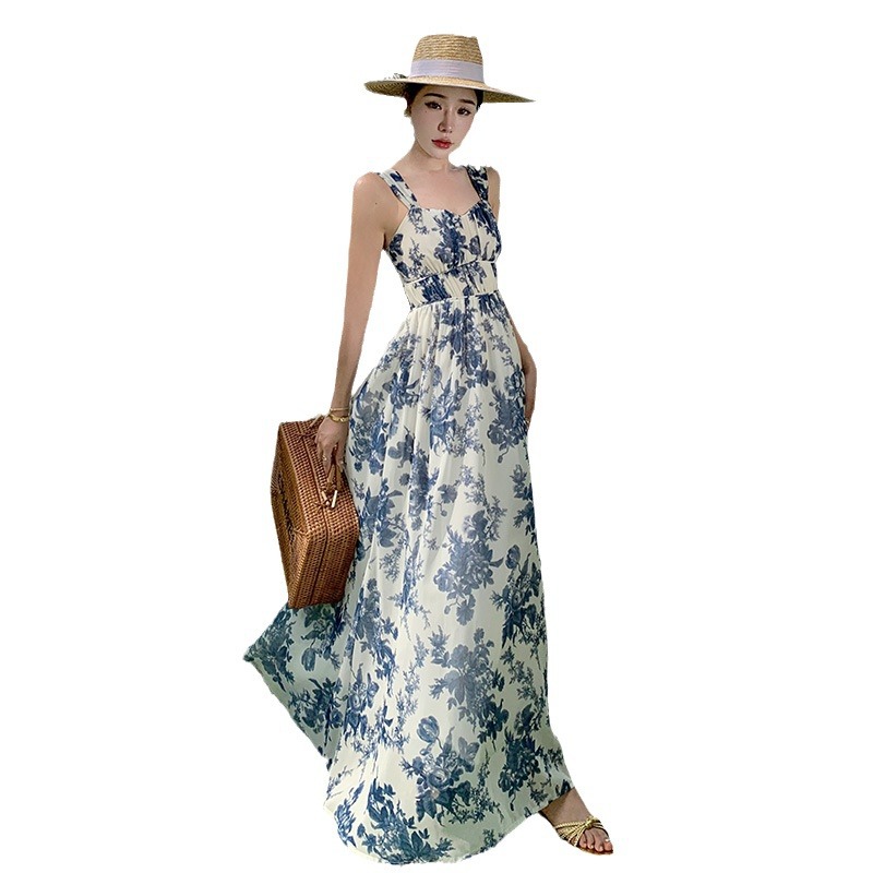 法式度假风吊带无袖收腰蓝色印花长裙拖地裙