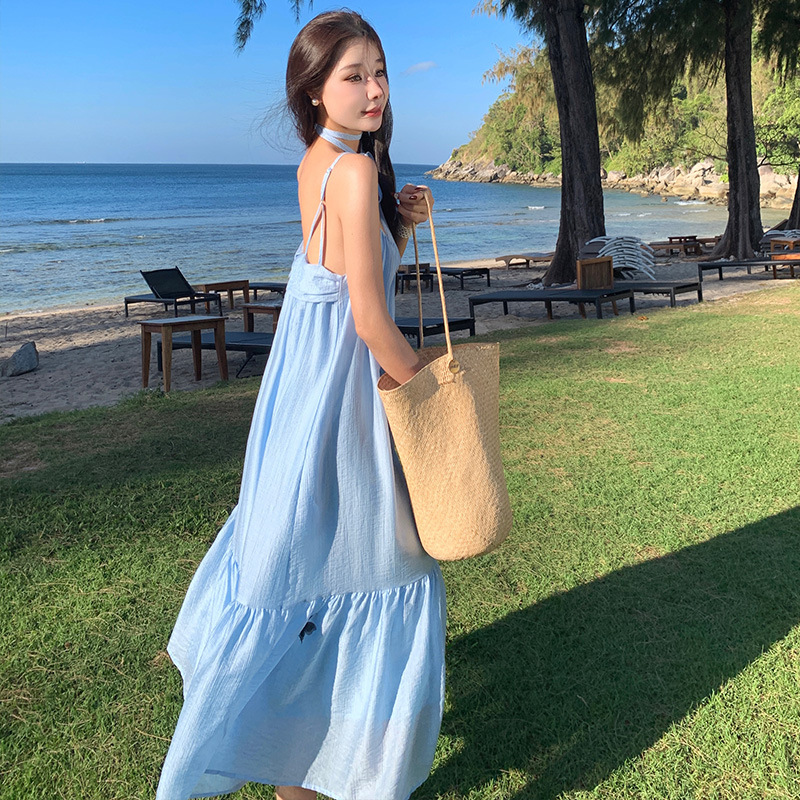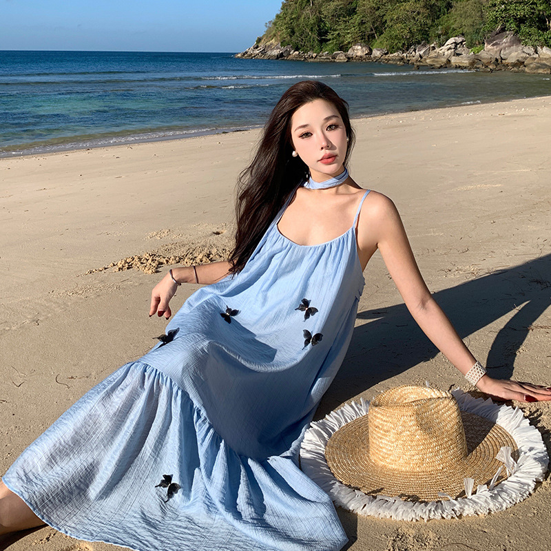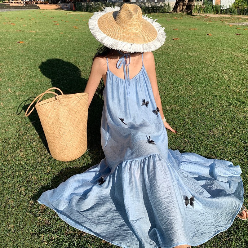 夏夜蝴蝶立体闪钻光泽感面料防透吊带连衣裙