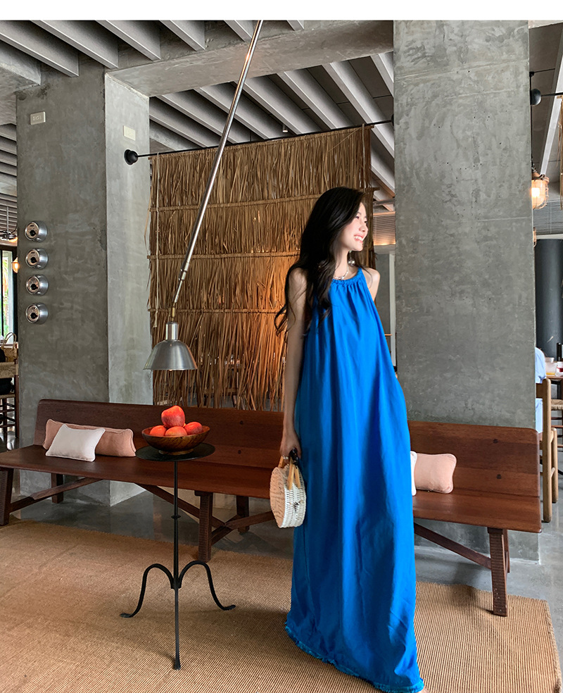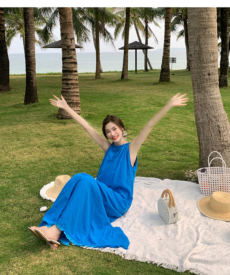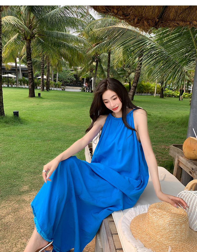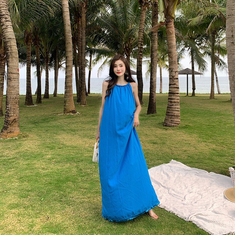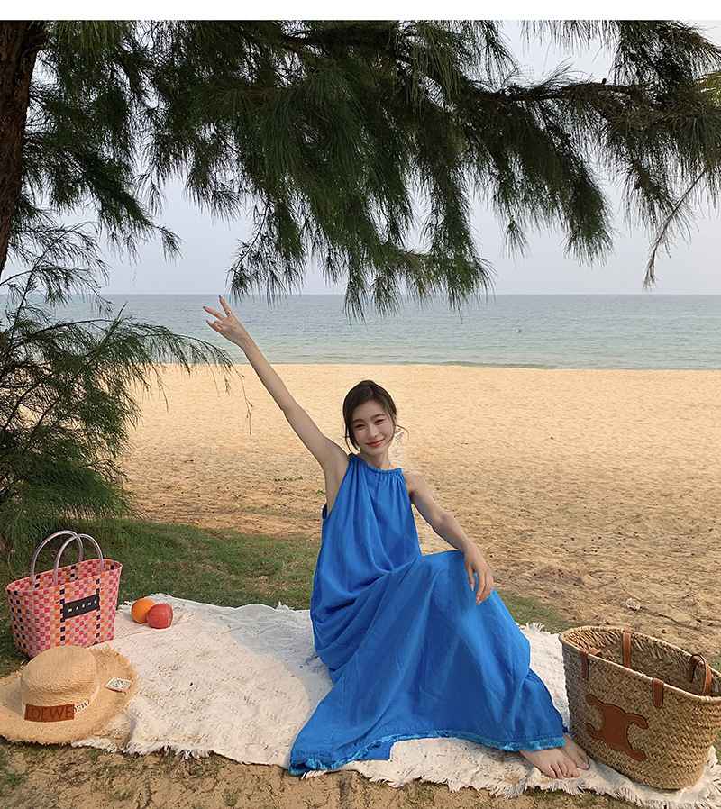 夏季海边沙滩度假无袖长裙子流苏系带法式挂脖吊带连衣裙女