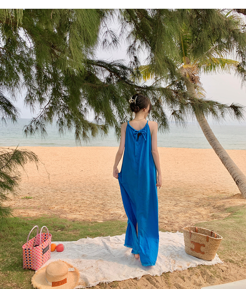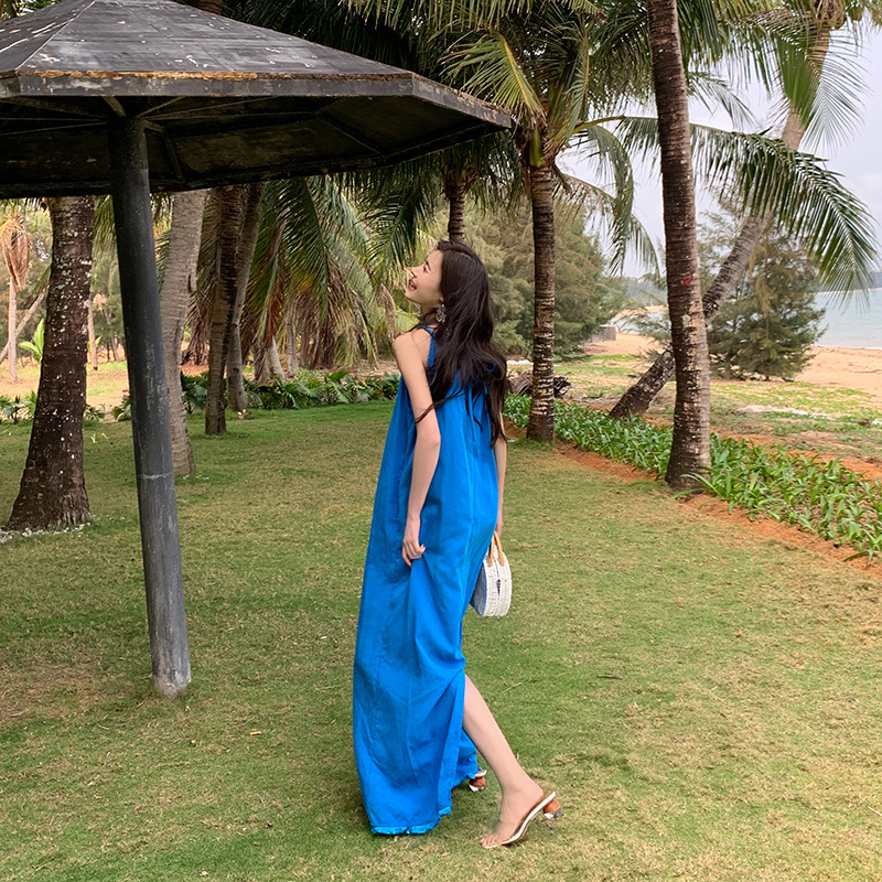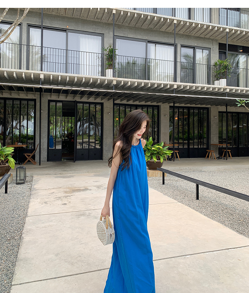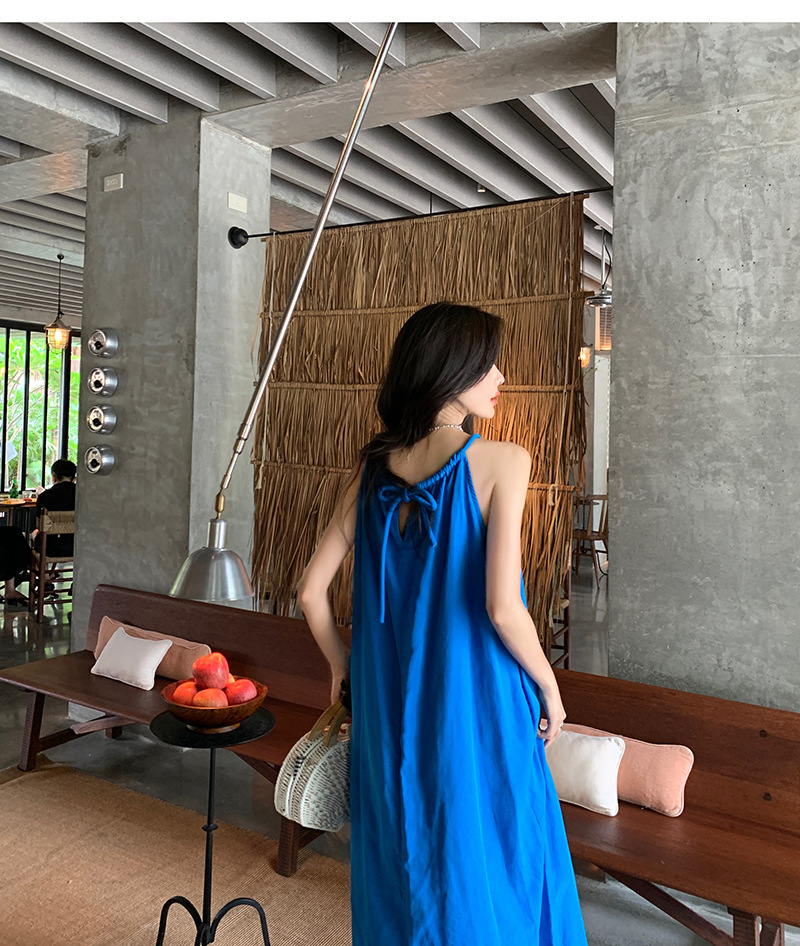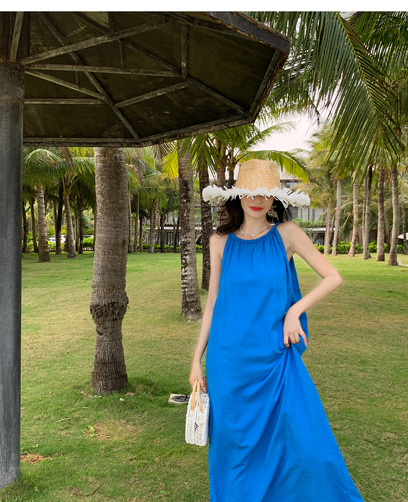 夏季海边沙滩度假无袖长裙子流苏系带法式挂脖吊带连衣裙女