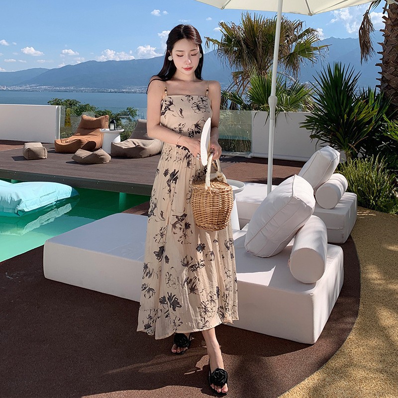 复古水墨渲染印花露腰吊带度假连衣裙女夏中长款开叉碎花裙女