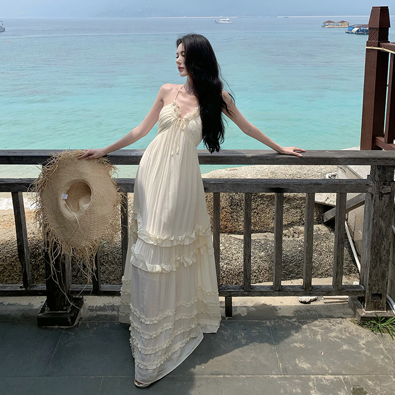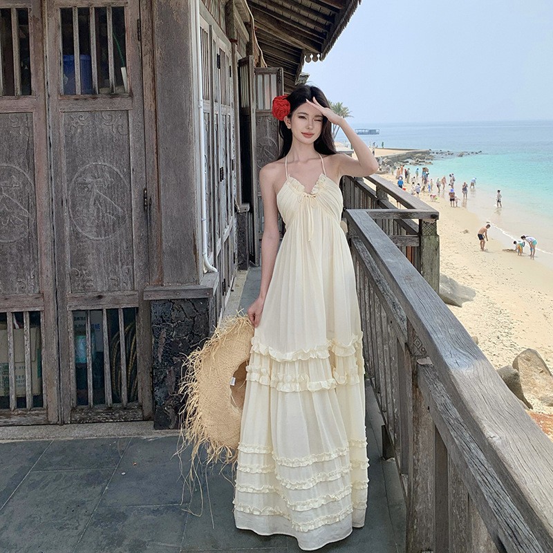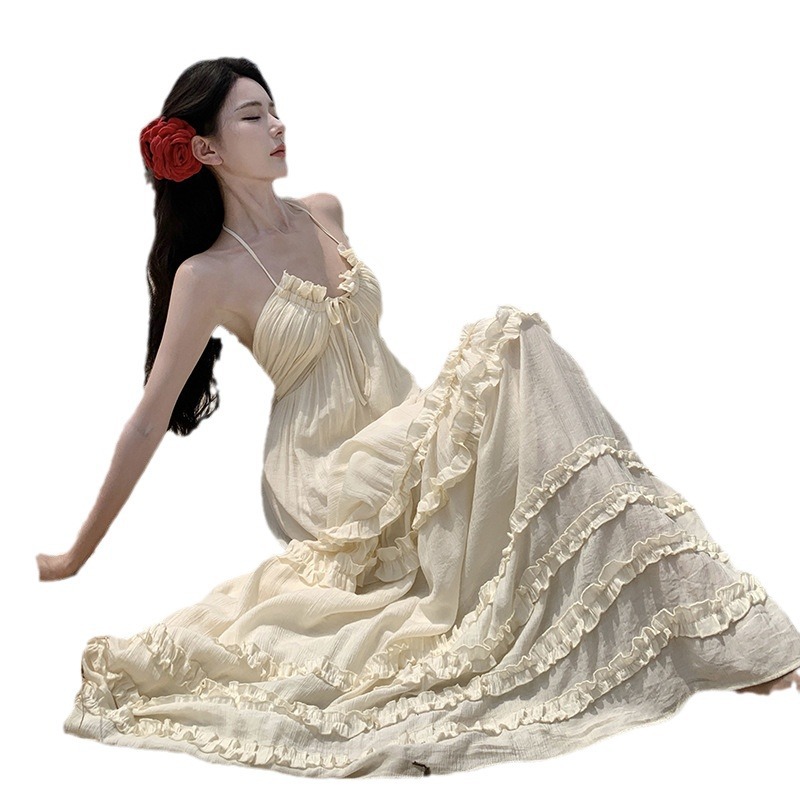 法式蝴蝶结吊带挂脖连衣裙女夏季宽松气质甜美风小个子短款蛋糕裙
