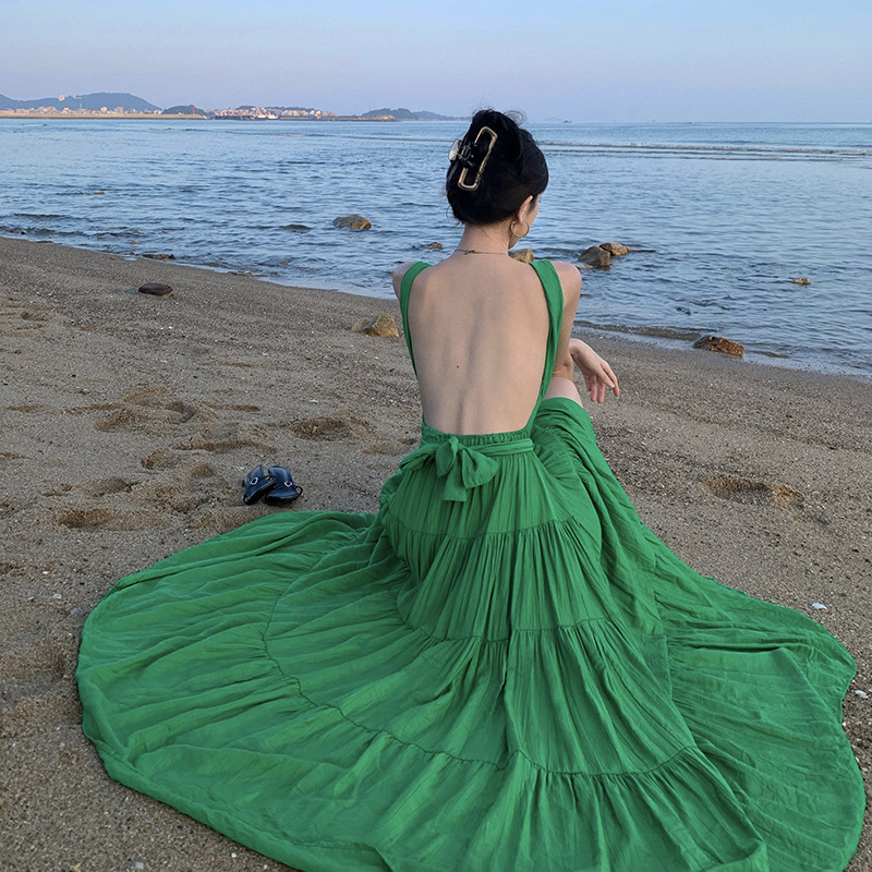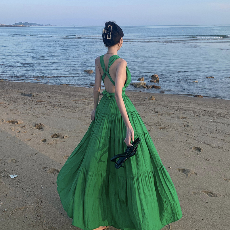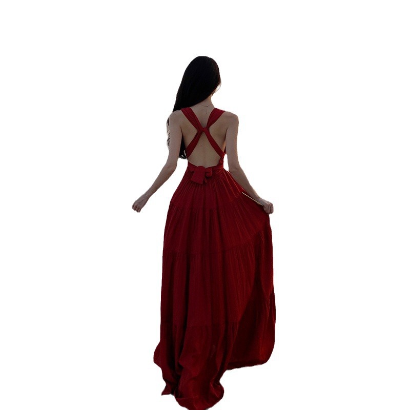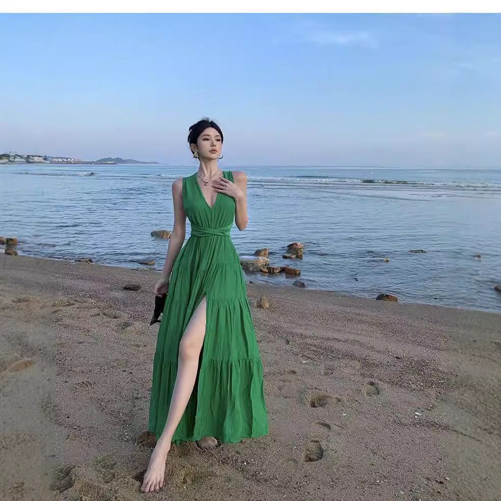 法式v领绑带挂脖连衣裙女海边度假绝美露背性感开叉显瘦长裙